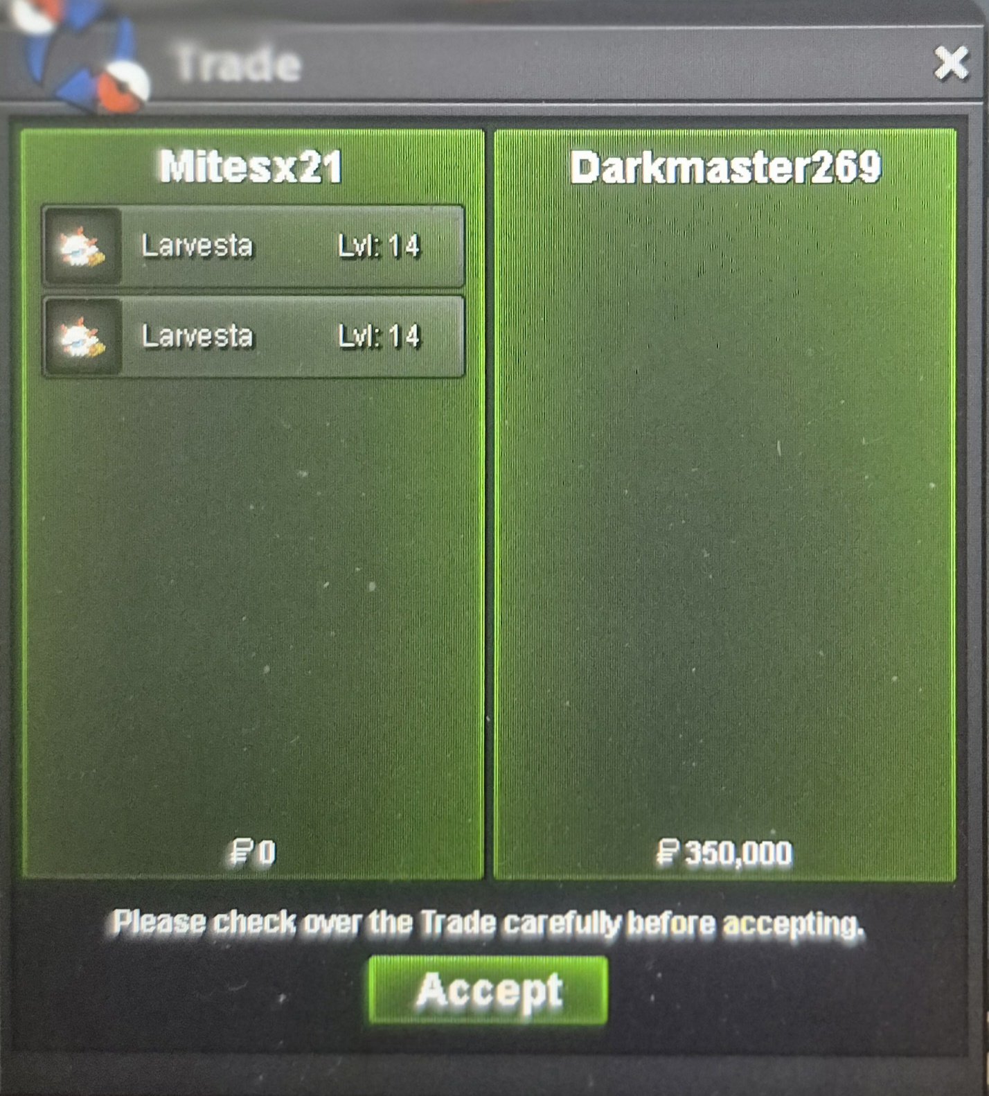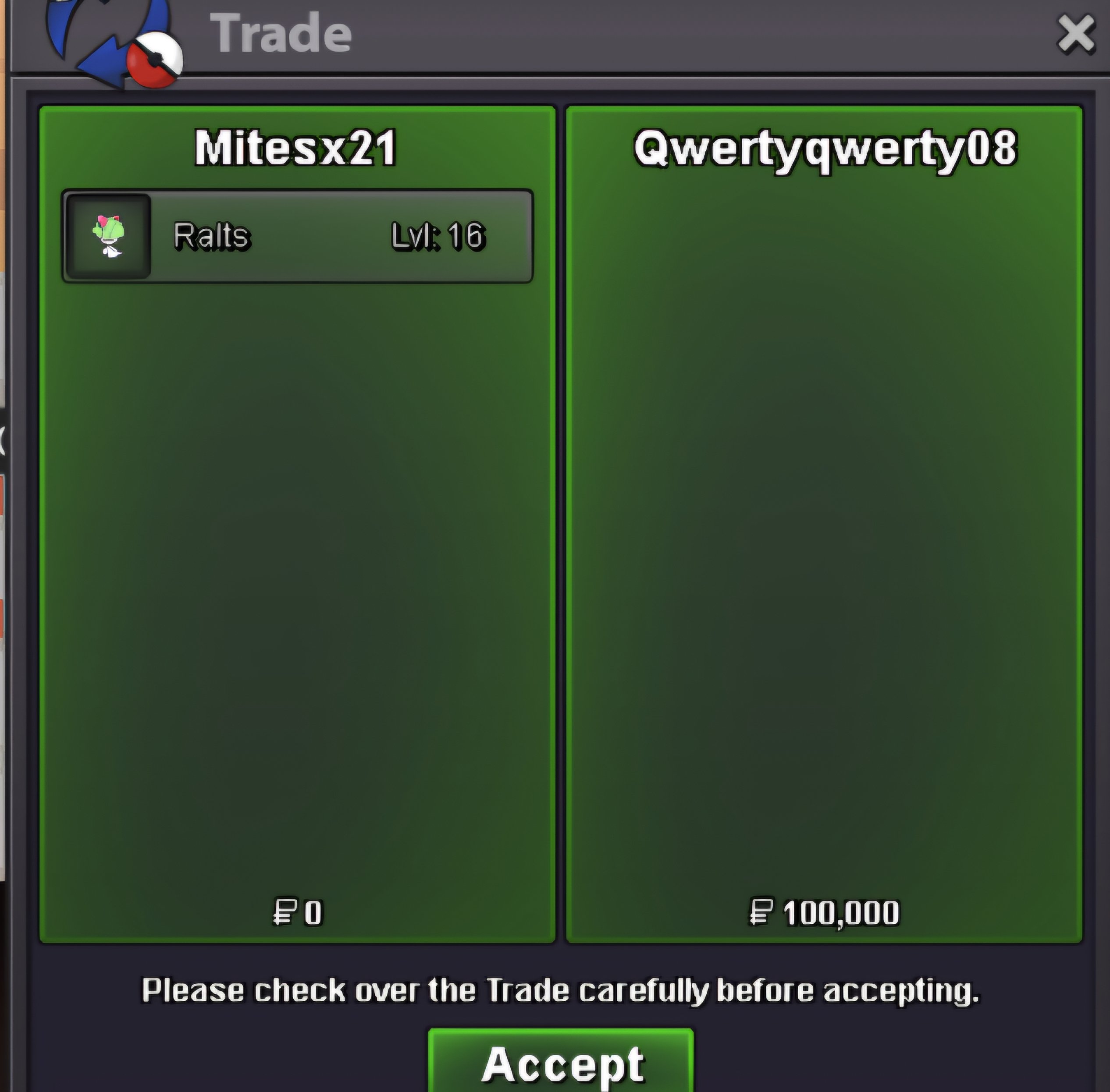Auction Details: Start Price: 100k End Point: 48 hours (after start bid) Insta Price: N/A Minimum Raise: 100k Accepted Payments: Pokedollars, Coin Capsules (460k), IV RR (650k), Nat RR (300k) Other Infos: If u re Gold and u win, u ve to transfer for redeem. 15 min rule is apply You can bid here or in game GOOD LUCK GUYS!