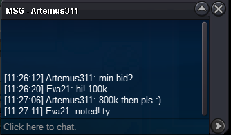 Starting bid: 1m Min bid: 100k Insta: 6m Duration: 48 h after starting bid is met Accepted payments: cc = 450k iv rr ticket = 700k