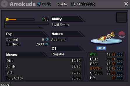 Arrokuda Ada 28/29 Auction Details Specting offer 200k End Point: 24 hours (after 1st bid) Insta Price: N/A Minimum Raise: 50k Accepted Payments: Pokedollars, Coin Capsules (x1 Coin Capsule = 500k), IV Reroll Tickets (x1 IV Reroll Ticket = 700k) If you intend to purchase with an alt account, specify the account alongside your bid. This is a silver auction if u are from gold you need to transfer. 15-minute auction rule