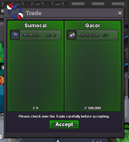 Auction Details: Start Price: 10k End Point: 30 minutes (after start price is met) Insta Price: N/A Minimum Raise: 10k Accepted Payments: Pokedollars Important Reminders: This is a Gold Server auction. If bidding from an alternative server, state that you will transfer upon winning. If you intend to purchase with an alt account, specify the account alongside your bid. If a bid is received in the final 15 minutes of the auction, the end point will be delayed by 15 minutes from that bid, and will be delayed by 15 minutes for each new bid thereafter, until the current offer has been held for a full 15 minutes. Happy Bidding!