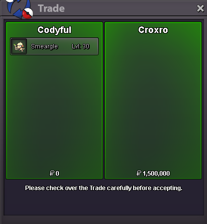 Alt account: Sumocal (Silver Server) Auction Details: Start Price: 15m End Point: 72 hours (after start price is met) Insta Price: N/A Minimum Raise: 500k Accepted Payments: Pokedollars, Coin Capsules (x1 Coin Capsule = 500k), IV Reroll Tickets (x1 IV Reroll Ticket = 750k) Important Reminders: This is a Cross Server auction. You may bid from any server, and I will transfer to your preferred server upon winning. If you intend to purchase with an alt account, specify the account alongside your bid. If a bid is received in the final 15 minutes of the auction, the end point will be delayed by 15 minutes from that bid, and will be delayed by 15 minutes for each new bid thereafter, until the current offer has been held for a full 15 minutes. Happy Bidding!