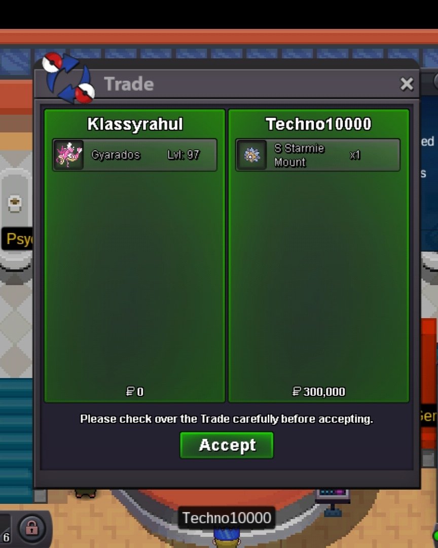 I have made an mistake in the game I traded 300k pokedollars and an shiny starmy mount for shiny gyaradous lvl 97 can u guys help me? Idh any proof but the mod can see my trade history