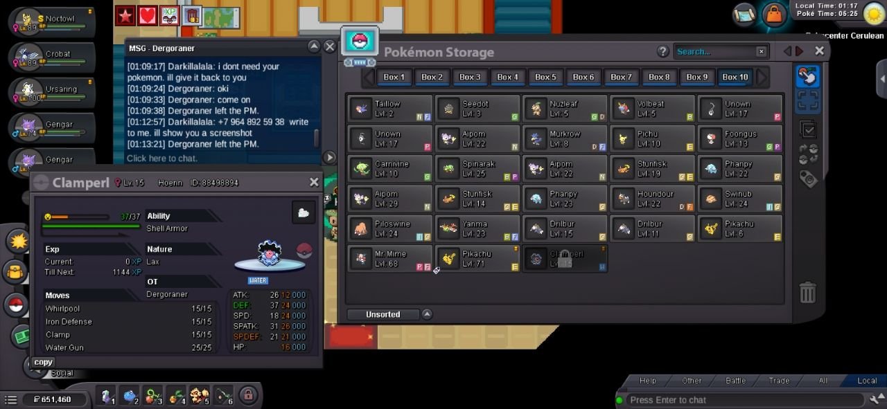 Hello. I need help with a Pokémon that became trade-locked in my PC. A player with the nickname Dergoraner asked me to help evolve their Pokémon via trade. They traded me Clamperl holding Deep Sea Pearl for evolution. After the trade, the Pokémon appeared in my PC storage but it is completely locked. I cannot move it, trade it back, or interact with it in any way. Right now it is just stuck in my storage box and I cannot return it to the owner. Could you please tell me what I should do in this situation? Do I need to unlock a specific region, complete a quest, or is this a bug that requires staff assistance? Thank you.
