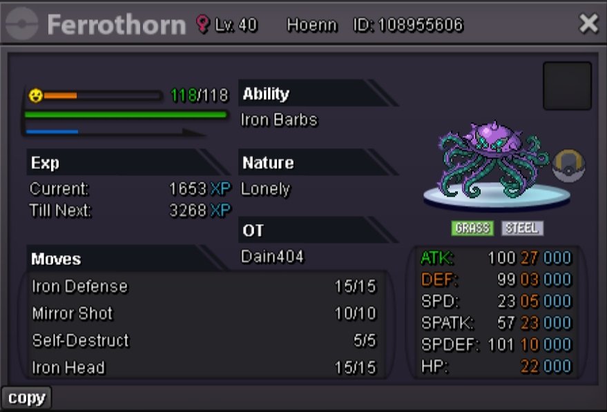 Auction Details: S.O: 50k Duration: 24 hours (after start) Insta: N/A Minimum Bid: 10k Accepted Payments: Pokedollars, Coin Capsule (x1 CC= 470k) Bid here or in-game Important reminders: • If you intend to purchase with an alt account, specify the account alongside your bid. • If a bid is received in the final 15 minutes of the auction, the end point will be delayed by 15 minutes from that bid, and will be delayed by 15 minutes for each new bid thereafter, until the current offer has been held for a full 15 minutes. Good luck and have fun!
