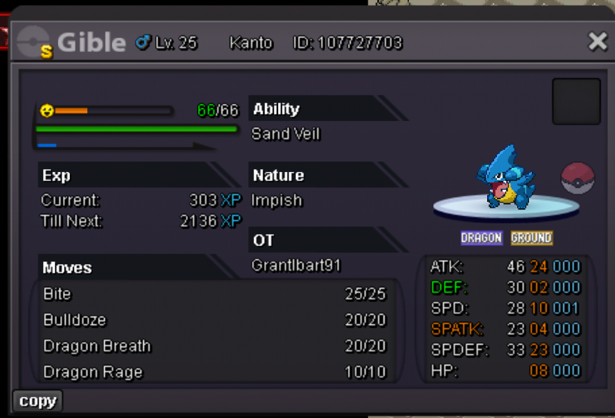 Server: Silver (Cross-server offers accepted) Start offer (s.o): 14m Min raise: 500 k Duration: 72 h after first valid offer Accepted payments: Pokédollars / CC ( – 500 k) insta 40m — serious bids only Details: – Shiny Gible (Impish / Sand Veil) – Collector shiny with rare value in market – Cross-server bids allowed (Silver / Gold) – Timer starts after first valid bid
