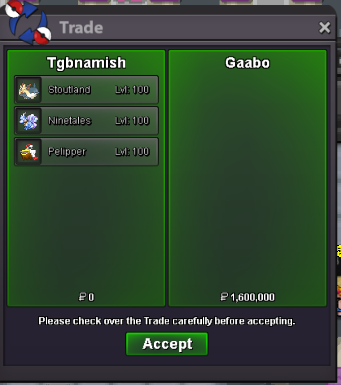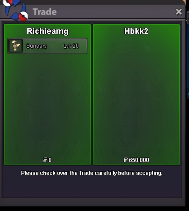 Hello all, I am writing to propose a simple yet impactful improvement to the in-game trading system. I suggest adding the in-game name of the player you were trading with to the trade window. (once trade was done) The Problem Currently, the trade interface does not display the name of the person you were trading with. This poses a couple of significant problems if we don't remember his name: - Scamming: Malicious players can take advantage of this by changing their character's appearance to mimic someone else, leading to scams where players might trade valuable Pokémon or items to the wrong person. - Forgetfulness: For players who engage in frequent trades, it can be easy to lose track of who you are trading with, what was offered, and what was agreed upon. This can lead to confusion and disputes. The Solution My suggestion is to add the other player's in-game name to the trade window. This would be a clear and visible addition that would instantly let you confirm the identity of the person you were trading with. Benefits of this Addition: - Enhanced Security: This would be a major deterrent to scammers and would provide players with a crucial piece of information to verify the identity of their trading partner. - Improved Clarity: It would eliminate any confusion about who you are trading with, making the trading process smoother and more transparent. - Better Record-Keeping: In the unfortunate event of a scam or a dispute, having the player's name in the trade window would provide clear additional evidence for any reports made to the game's staff. Conclusion Adding the player's name to the trade window is a small change that would have a huge positive impact on the trading experience in Pokemon Revolution Online. It would make trading safer, more transparent, and more user-friendly for everyone. Thank you for your time and consideration. I look forward to hearing the community's thoughts on this suggestion. It should look like this;