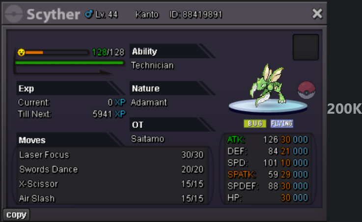 Start Price: 300k End Point: 24h after start price is meet Insta Price: 2m Minimum Raise: 100k Accepted Payments: Pokedollars, Coin Capsules (x1 Coin Capsule = 500k), iv rr = 700k Important Reminders: This is a Silver Server auction. If bidding from an alternative server, state that you will transfer upon winning. If a bid is received in the final 15 minutes of the auction, the end point will be delayed by 15 minutes from that bid, and will be delayed by 15 minutes for each new bid thereafter, until the current offer has been held for a full 15 minutes.