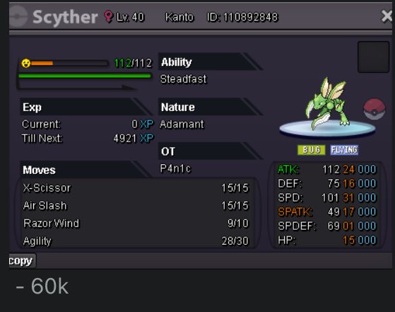 Auction Details: Start Price: 500k End Point: 24 hours (after start price is met) Insta Price: N/A Minimum Raise: 100k Accepted Payments: Pokedollars, Coin Capsules (x1 Coin Capsule = 500k) Important Reminders: - If you intend to purchase with an alt account, specify the account alongside your bid. - If a bid is received in the final 15 minutes of the auction, the end point will be delayed by 15 minutes from that bid, and will be delayed by 15 minutes for each new bid thereafter, until the current offer has been held for a full 15 minutes.