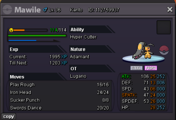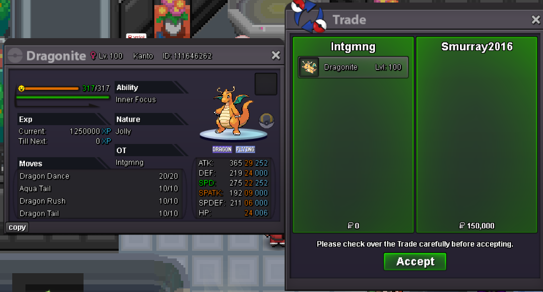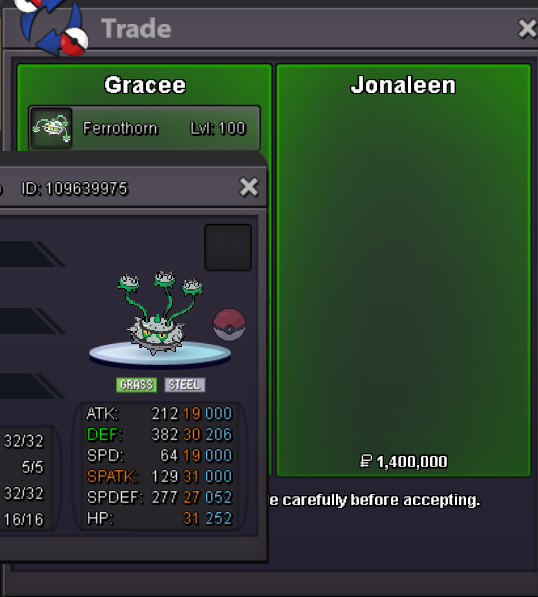 Hello everyone and welcome to my auction! Auction Details: Starting Offer: 450k Pokedollars Minimum Raise: 100k Pokedollars Insta Price: N/A End Point: 48 hours after Starting Offer is met Accepted Payments: Pokedollars only Important Reminders: This is a Silver Server auction. If you bid from Gold Server, then you will have to transfer to Silver Server. If you intend to purchase with an alt account, specify the account alongside your bid. If a bid is received in the final 15 minutes of the auction, the end point will be delayed by 15 minutes from that bid, and will be delayed by 15 minutes for each new bid thereafter, until the current offer has been held for a full 15 minutes. Happy Bidding!