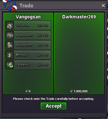 Start the auction Start: 100k Poke$ Minimum raise: 50k End Point: 24 hours (Since the start of the auction) Insta Price: 6m Start: 100k Poke$ Minimum raise: 50k End Point: 24 hours (Since the start of the auction) Insta Price: 4m Note: - Accepted Payments: Pokedollars, Reroll Ticket: 750k each, Coin Capsule: 500k each. - If a bid is received in the last 15 minutes of the auction, the closing time will be delayed by 15 minutes from that bid, and will be further delayed by 15 minutes for each subsequent new bid, until the current bid has remained unchanged for the full 15 minutes. - This is a Gold Server auction. If bidding from an alternative server, state that you will transfer upon winning. - Encourage c.o on the forum at the last minute to avoid delays, thanks!