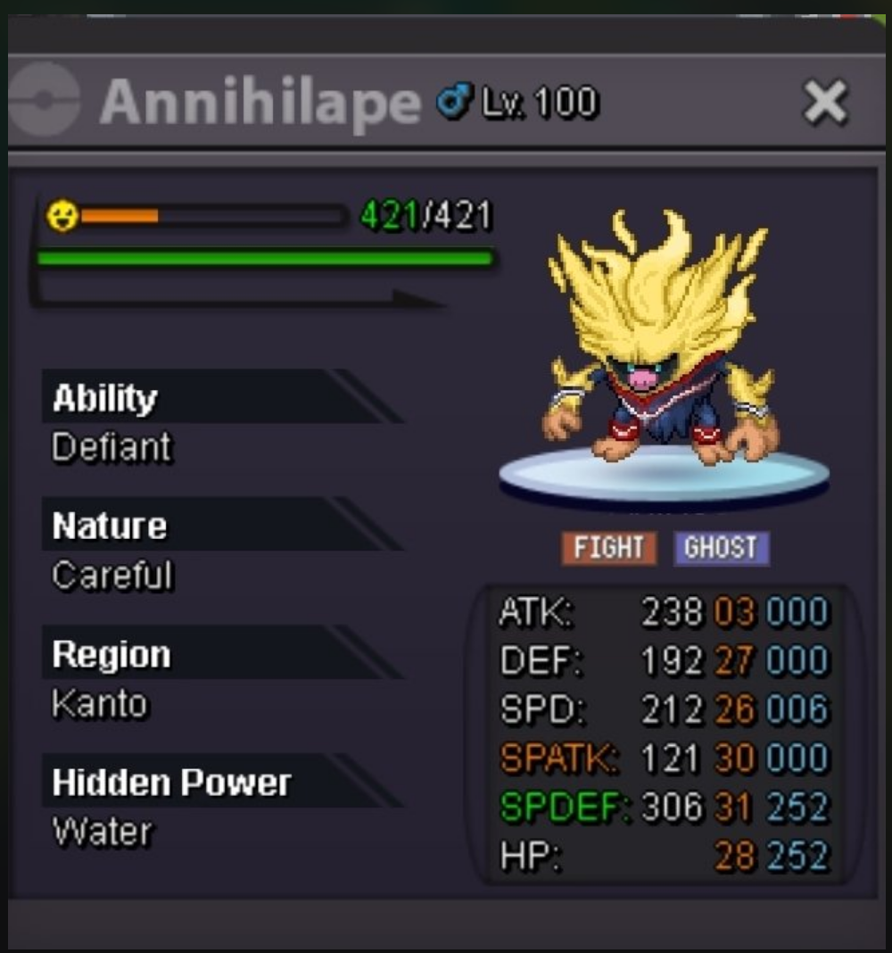 Auction Details Start Price: 8m End Point: UK time 8pm Thursday Insta Price: N/A Minimum Raise: 500k Accepted Payments: Pokedollars/Items You can also pay with these (max 20% of total price) Reroll Ticket: 700k each. Nature Reroll: 350k each. Coin Capsule: 450k each. Important Reminders This is a Cross Server auction. You may bid from any server, I will transfer to your preferred server upon winning if you intend to purchase with an alt account, specify the account alongside your bid. If a bid is received in the final 15 minutes of the auction, the end point will be delayed by 15 minutes from that bid, and will be delayed by 15 minutes for each new bid thereafter, until the current offer has been held for a full 15 minutes.