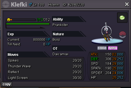 Auction Details: Start Price: 3m End Point: 24 hours (after start price is met) Insta Price: N/A Minimum Raise: 100k Accepted Payments: Pokedollars, Coin Capsules (x1 Coin Capsule = 500k), IV Reroll Tickets (x1 IV Reroll Ticket = 700k) Important Reminders: This is a Cross Server auction. You may bid from any server but you need to transfer. (This Poke is in silver) If you intend to purchase with an alt account, specify the account alongside your bid. If a bid is received in the final 15 minutes of the auction, the end point will be delayed by 15 minutes from that bid, and will be delayed by 15 minutes for each new bid thereafter, until the current offer has been held for a full 15 minutes. Happy Bidding!