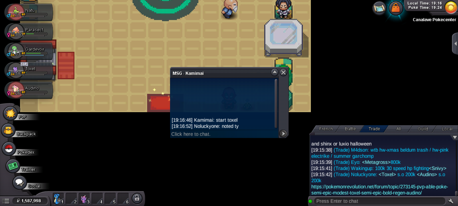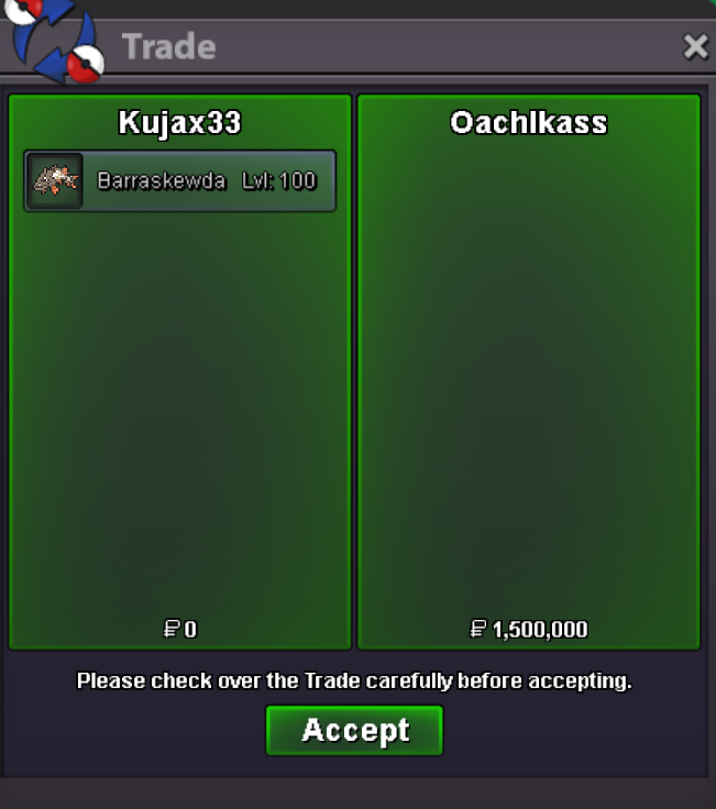 @Tracekun I’ve shared a link to the "Trade Rules" below. Make sure to read through them. The trade terminology you mentioned is also useful, as these are common phrases players use to describe what they’re looking for or offering. As for how trading works: once you’ve earned your 4th Kanto badge, the trade feature becomes available. To complete a trade, both players need to be in the same Pokémon Center, since all trades take place there. Trades are usually arranged through direct messages, where you negotiate the terms and agree on a meeting location. If you’re on a laptop or desktop, simply right click the other player’s username and select "Trade". On mobile, simply tap the character to access the trade option. From there, drag and drop the Pokémon from your party or an item from your bag into the trade window. Before confirming, take a moment to review the trade carefully. Make sure everything looks correct, including any pokedollars or items involved. Once both players confirm, the trade is completed. It’s very straightforward once you’ve done it a few times. If you’re new, trading with a more experienced player at first can help you get comfortable with the process. [Forums and In-Game] General Trade Rules. - PRO Rules - Pokemon Revolution Online P.S. Regarding “Best Offer”. This is an area where you need to be careful. When trading, players should follow one of three clear approaches: Ask for offers (and accept or decline them), run a proper auction, or set a fixed price. Using a vague “Best Offer” approach is not allowed. Any offers received privately or outside of a formal, public auction cannot be presented or claimed as the “best offer” in public chats or the forum. Be clear and transparent with your pricing. This helps keep trading fair for everyone.