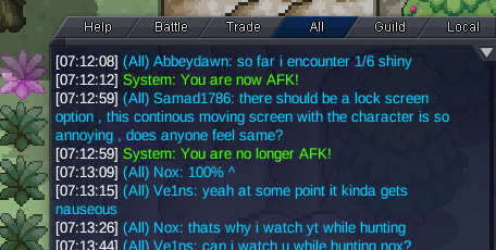 While hunting any pokemon when our character moves left-right the screen also moves which feels super annoying. There are some corner grass patches in some maps where the screen does not move and hunting in them feels very good but most maps don't have spots like that. Some people also get a little bit of dizzy or nausea type of feel from this continuous screen movement. I have also talked with some people in all chat about this. Here's a screenshot of that If the devs can can create a screen lock checkbox option it would be a great help. If agree please +1 Thank you