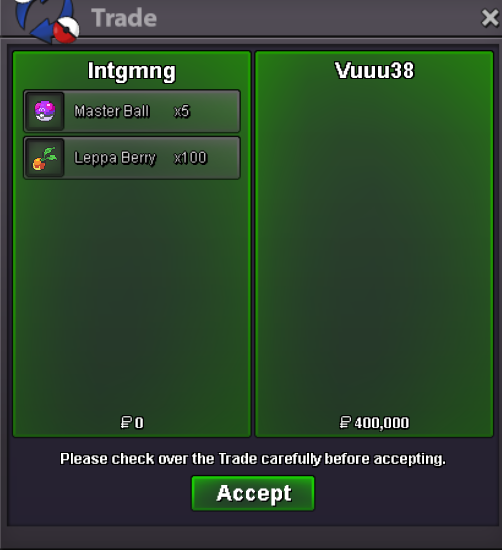 Auction Details Start Price: 8m End Point: 3 days after first bid Insta Price: N/A Minimum Raise: 200k Accepted Payments: Pokedollars/Items You can also pay with these (max 20% of total price) Reroll Ticket: 700k each. Nature Reroll: 350k each. Coin Capsule: 450k each. Important Reminders This is a Cross Server auction. You may bid from any server, I will transfer to your preferred server upon winning if you intend to purchase with an alt account, specify the account alongside your bid. If a bid is received in the final 15 minutes of the auction, the end point will be delayed by 15 minutes from that bid, and will be delayed by 15 minutes for each new bid thereafter, until the current offer has been held for a full 15 minutes.
