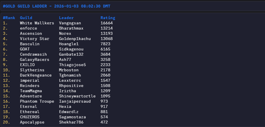 Greetings Trainers, apologies for the delay. Without further ado, here are PvP Season results! Like always, we would like to thank everyone for giving PRO a competitive environment for another season. We would also like to congratulate each player and guild who made it to the top of the ladder, it's not an easy feat reaching the top. We all wish you the best in the next season. Thanks for participating! REWARDS: Normally, 1st Place will receive 600 PvP coins, 2nd place 595, and so on. Top ladder guilds shall receive 25% EXP Boost for the entirety of the next season! Additionally, Top 25 players from each server will receive: Access to Tutor Heaven! An exclusive Victorious Chroma! Special rewards will be distributed every 12 hours to those who reach the top 25 during this PvP Season, the distribution is as follows: 1st Place: 5× PvP Chests 2nd–3rd Place: 4× PvP Chests 4th–10th Place: 3× PvP Chests 11th–19th Place: 2× PvP Chests 20th–25th Place: 1× PvP Chests * Golden PvP Chests have better odds to give exclusive cosmetics! RANKED LADDER RESULTS: Top 25 Silver Ranked Rating (No Tier Ladder) Top 25 Gold Ranked Rating (No Tier Ladder) RANDOM RANKED LADDER RESULTS: Top 25 Silver Random Ranked Rating (No Tier Ladder) Top 25 Gold Random Ranked Rating (No Tier Ladder) RANKED GUILD LADDER RESULTS: Silver Guild Rating Gold Guild Rating Disclaimer: Results may have a marginal difference to ones recorded by other players. The results taken were taken seconds before the ladder was reset, whilst the servers were offline. If you used a Discord bot, or gathered your own screenshots earlier than us, your results may be inaccurate. If you are or aren't on the ladder when you think you should/n't be, please contact Kimew via Forum Threads. Please note that users with the exact same rating may switched positions during the reward process, we have no influence over that.