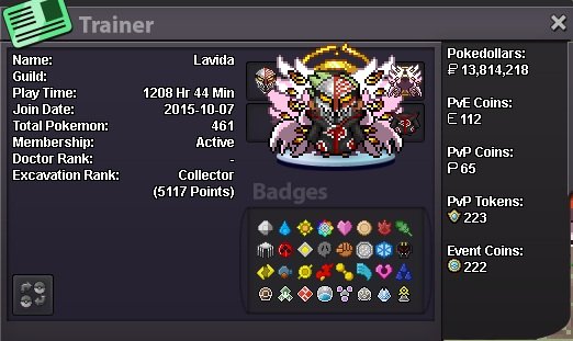 1. What's your Player name (IGN)? Lavida 2. Number of hours played? 1200 3. What's your favorite Pokemon? ursaluna 4. What do you enjoy doing the most in PRO? (Hunting, Dungeons, PvP, trading, etc) hunting,pvp 5. Screenshot of your Trainer Card