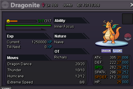 Start Price: 100k End Point: 48 hours (after start price is met) Minimum Raise: 100k Insta Price 5m Accepted Payments: Pokedollars, Coin Capsules (x1 Coin Capsule = 500k), IV Reroll Tickets (x1 IV Reroll Ticket = 700k) Important Reminders: This is a Cross Server auction. You may bid from any server, and I will transfer to your preferred server upon winning. If a bid is received in the final 15 minutes of the auction, the end point will be delayed by 15 minutes from that bid, and will be delayed by 15 minutes for each new bid thereafter, until the current offer has been held for a full 15 minutes.
