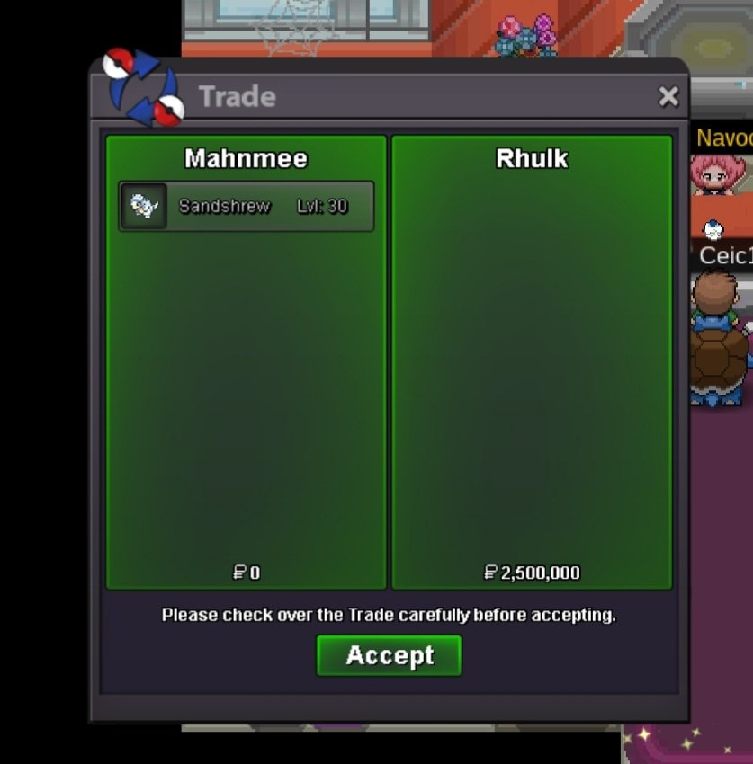 Starting the auction : 2M Minimum bid : 100k Instant sale : No The auction will end 72 hours after the first bid. ------------------------------------------------------------------------ Starting the auction : 1.5m Minimum bid : 100k Instant sale : No The auction will end 72 hours after the first bid. Accepted payments: Pokedollars Reroll Ticket: 600k each. Coin Capsule: 450k each. Black Medallion: 225k each.