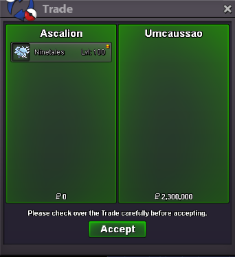 Details: Start Price : 500k Min Bid: 100k Insta: 2m End point: 48 hours after initial bid Accepted Payment: Pokedollars, Coin Capsules (x1 Coin Capsule = 500k) This is a silver Server auction. You may bid from any server but you must transfer to silver Server upon winning the auction. You may place bids here or in game. The 15 Minute rule will go into effect if a bid is placed in the last 15 minutes