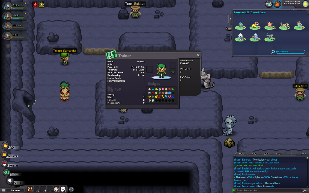 Changelog 04.11.2018: All water mounts except Wailmer have the same speed now (50 % faster than normal mounts, 50 % slower than Kyogre). Akatsuki Robe, Turtle School Uniform Snorlax Mounts are available in the PvE Coin shop. PvE and PvP Coin shops were reworked and are actual shops now. PVE Coin shop randomly chooses 5 Pokemon you can buy with 50 PvE Coins from a pool of 26 Pokemon every week. PvE Coin NPC added to Celadon Mart 4, Battle Tower Entrace, Lilycove Department Store 2F, Goldenrod Mart 5 maps. You have to wait 30 seconds between your posts in Trade chat now. Changelog 09.11.2018: Most if not all reported bugs about the new client should be fixed. Team Preview was completely reworked. Timer changed to 60 seconds. [*]Weather effect visual bug was fixed. [*]The Pokemon sprites in Pokedex preview forms and shinies now if you left click them. [*]A few Pokeballs work now. Level Ball Lure Ball Moon Ball Friend Ball Fast Ball Repeat Ball Nest Ball Net Ball Heal Ball [*]Manage Guild has a Leave Guild button now. [*]Many small changes/additions.1 point
