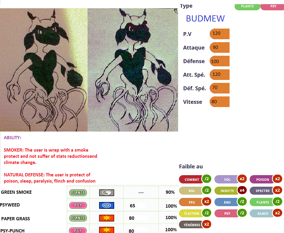 -IGN: Goldorako -Discord name: Badsolute -Pokemon name: Budmew -Pokemon typing: GRASS/ PSY -Pokemon description: Budmew was created just with a black pen (bic) and a green pen (bic) in 10 minutes ! xD No seriously...: -Budmew was born long before Mewtwo was created. It's a sciences project when the scientists injected the Mew ADN in a Tangela but the Pokemon fast asleep and never wake-up!!! The scientists abandoned the Budmew pokeball in the jungle but this pokeball make a roots underground during a strange smoke...and a grass was created. A flower was born with Budmew in his heart. MOVE SET: - Green Smoke - PWR / 90 ACC SPATK/GRASS During 5 tours, a strange green smoke is created and the Hp of the target's is absorbed. - Paper Grass -80 PWR / 100 ACC ATK/GRASS The launcher fight and cut the target's with a very fine leaf and lower the DEF stats of the target's - Psyweed -65 PWR / 100 ACC SPATK/PSY The launcher send a green wave on the target. This move is doubled if green smoke is actived. - Psy-Punch -80 PWR/ 100 ACC ATK/PSY The launcher closed the flower on his left arm and speedly fight the target's. Also, the target's fast asleep. STATS: 90 ATK / 100 DEF / 80 SPE / 120 SPATK / 70 SPDEF / 120 HP ABILITY: - Smoker : The user is wrap with a smoke protect and not suffer of stats reductions and climate change. - Natural defense: The user is protect of poison, sleep, paralysis , flinch and confusion. Sorry for my english...Thank you1 point