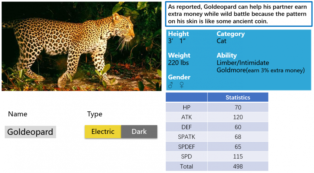 - IGN: TeddyPKM - Discord name: Teddy#3686 - Pokemon name: Goldeopard - Pokemon Typing: Electric/Dark - Pokemon description: Goldeopard is a kind of very ancient and rare leopard, spreading aroung all over the world. But because of their strong caution and high reaction rate, high running speed, they seldom appear in front of people. Except that this boy or girl is trustable and friendly to pokemons, then the Goldeopard will show up and become mild willingly. It's reported that Goldeopard can bring extra money to people aound him. That's also one of reasons people love Goldeopard. - Picture/drawing (optional):1 point