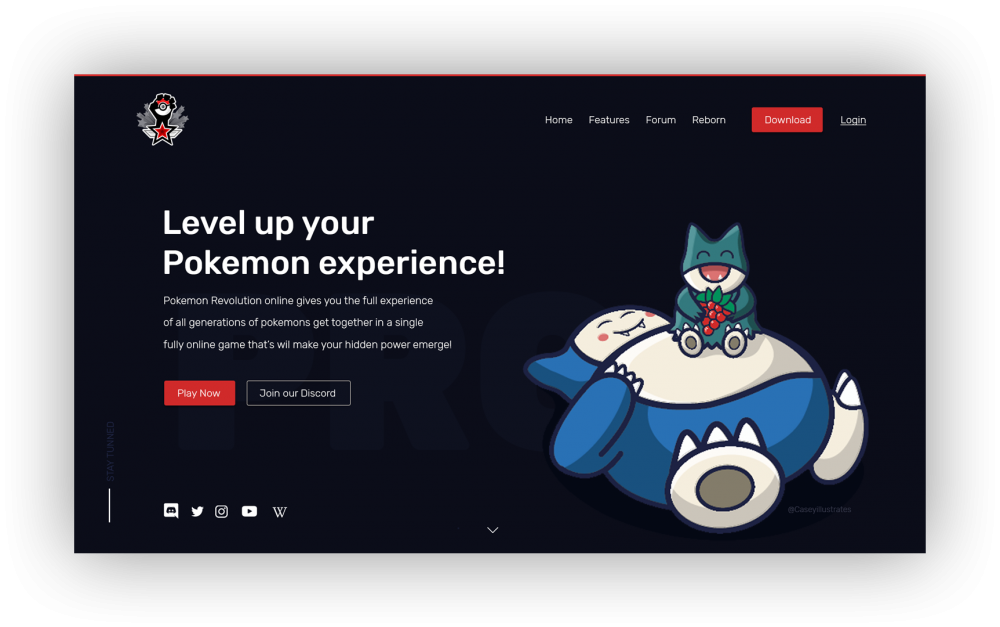 Hello, as requested here are my remarks, I find the black background not suitable for this kind of homepage, a game website want to be played and with a black background is not the case (personal opinion). Still subjective but i don't really like the illustration of the 2 Pokemons, I think put starters or a Pikachu already have more sense for the players. For the buttons on the top right, I find them more elegant and better placed than before ! And putting down the social network icons is a good idea, it is less the impression that the site is 'overloaded' information at the top. Overall, it's still a good job!1 point