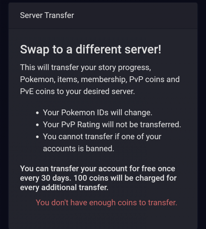 When trying to transfer to silver server it says I don't have enough coins but it has been over 30 days since my last free transfer I think this must be bugged or either it is thinking the times I transferred with coins were the free times and restarting the 30 day count after I used coins to transfer. Not sure what's going on but can someone please look into it1 point