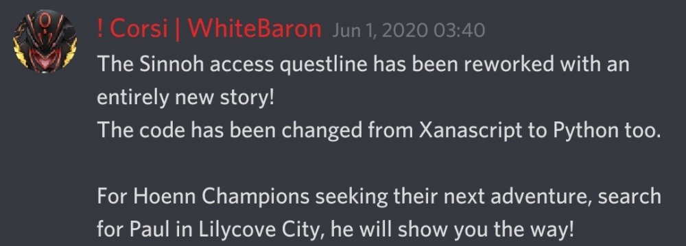 Hello @Wonta, The Quest to go to Sinnoh got changed as announced in our Discord. So the old one got removed, sadly that includes all the Progress made already aswell. You can start the new Quest by talking to Paul next to the Lighthouse in Lilycove. And if you need help you can check out the Guide from Bhimoso. I hope that helped. Greetings, M3ru3m1 point