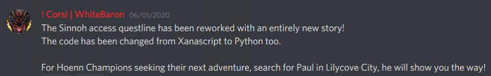 Since the most recent change just a few days ago (hours, even), the quest to access Sinnoh has been completely replaced. If you were in the middle of the quest, about to start it or had beaten Hannah but not talked to her and teleported to Sinnoh, you'll have to start the new one from scratch. Good luck, trainer! VERY BIG WARNING: ONCE YOU ENTER ROUTE 101 TO FIGHT THE GRUNTS, DO NOT, I REPEAT, DO NOT GO BACK TO LITTLEROOT TOWN. IF THE NPCS DISAPPEAR AND YOU CANNOT PROGRESS, POST HERE: https://pokemonrevolution.net/forum/topic/871-url . THERE SEEMS TO BE A BUG WHERE, IF YOU GO BACK TO THE TOWN AND THEN REENTER ROUTE 101, THE GRUNTS COMPLETELY DISAPPEAR AND YOU CANNOT CONTINUE THE QUEST UNTIL YOU ARE HELPED BY PRO STAFF. WELCOME TO THE SINNOH ACCESS QUEST GUIDE! The quest will start once you speak to the NPC Paul in Lilycove City (Hoenn). You need to have 6 pokemon in your team that are at the very least level 80 or above. This can be acheived by training them in Mount Silver or in Cerulean Cave as the NPC says. However, getting access to Cerulean Cave is painful, so we can also borrow a friend's team. The pokemon do not have to be ours to be valid for the quest, so we can borrow 6 pokemon at level 80 from a friend or train them ourselves. He will then teleport us back to Littleroot Town. Once you exit your house, you'll find unwanted visitors: Team Galaxy Grunts! The villagers need help! You will then approach Stan, who stares at you, menacingly (yes, this is a Jojo's reference). He will fight you with strong pokemon. He has a level 70 Exploud, Hariyama, Crobat and Purugly. They will then Teleport and escape. Go north to route 101. More grunts will appear. The next one has a level 70 Mightyena, Dustox, Masquerain and Luxray. Grunt Bernie is next. He has a level 70 Mawile, Aggron, Electrode and Skuntank. Grunt Jack comes afterwards. this will take long... He has a level 70 Cacturne, Altaria, Whiscash and Bronzong. Grunt Mario has a level 70 Whiscash, Claydol, Banette, and Drapion. There's still more! Grunt Karina has a level 70 Medicham, Dusclops, Glalie and Toxicroak. The last Grunt, Vincent, has a level 70 Absol, Tropius, Flygon and Weavile. You will then reach Oldale Town. Heal up and try to go to Route 102. Stan will block the way and fight you with his level 100 Alakazam. When he's defeated, he will teleport you to Route 103. You'll see Mars, Saturn, Pluton and Birch. However, you'll hear a mysterious voice: Maxie and Archie will take care of two of them, while you'll fight Pluton. He is a tough one. Pluton has a level 100 Slowking who will spam Scald, a Rotom-Wash, a Porygon-Z, a Blaziken, a Sceptile and Swampert (the pokemon they forced to evolve, it seems). Since many people asked for help on this step, I will give you an example strategy of how you can beat this boss easily: 1.- Geodude with Sturdy + Stealth Rock (or any evolution, you can capture one in Mt Silver with the moveset ready as Graveler) 2.- Electrode with Eerie Impulse (you can get one at a high level already in Cerulean Cave) 3.- 1 Pokemon with a good setup move. Examples: Gyarados with Dragon Dance, Clefable with Cosmic Power, Slowbro with Calm Mind and Iron Defense, etc. For this boss, I recommend you either unlock the Mega Slowbro Stone or you use a Clefable, easy to farm and use. You begin by using Stealth Rock with Graveler and letting it faint. Then you Eerie Impulse multiple times against the Slowking and faint your Electrode. After this, switch in your pokemon with a setup move equipped with leftovers, set up until your stats are maxed and you will be able to sweep. Example: Clefable - Cosmic Power, Toxic, Softboiled, Moonblast Gyarados - Dragon Dance, Earthquake, Waterfall, Ice Fang Slowbro - Iron Defense, Calm Mind, Slack Off, Surf However, they will escape after you defeat him. You will talk to Birch and he'll actually tell you that the three Hoenn starters are lost in Route 101 and 102. Mudkip can be found just below Birch in the Route 103. You need Surf to pick him up here. Torchic will be hiding in the spot in front of me in Route 101. Interact with it to rescue the lost pokémon. Treecko will be hidden in front of me in this spot in Route 102. Interact with it as you did before. Once you have picked up the three Pokemon, talk with Birch. He will tell you to go and talk to Alakazam. He can be found in the Docks in Lilycove City (same place you can go and get the boat to go back to Vermillion and Olivine. Congratulations, you've now completed the new Sinnoh Quest! VERY BIG WARNING: ONCE YOU ENTER SINNOH, THERE IS NO GOING BACK. YOU MUST DEFEAT THE ELITE FOUR IF YOU WANT TO GO BACK TO THE PREVIOUS REGIONS. Special thanks to: @WhiteBaron (mr corsi handsome french boy) for helping me out and fixing the variables that bugged while I was doing the quest. @Donuts02 for lending me his level 100s so I could rush Hoenn to do a guide of the quest for forums. @jimmicha for rushing my account story in Silver so I could do more guides for forums.1 point