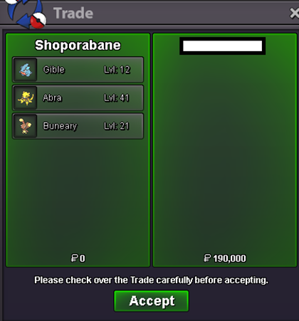 IF A TRADE MODERATOR HAVE TO FORCE A TRADE , ALL POKEMON WAS ON SHOPORABANE ACCOUNT Total Pokemon for sale : 330 Total Pokemon sold : 416 What you need to know First of all (Pokemon Lv 100 shop part) I capture, I do the Ev's and I level these to level 100. Then I sell them. Thanks to not complaining about some mooveset not done. Pokemon Shop Rules - Cross Server only if u come on SILVER. - Fake offers --> Instantly Reported. - No auction here. - First buyer who confirms the purchase will have the pokemon, even if someone intends to buy it more expensive. - Purchase can mixing Item and money, do the difference. - Only accept items on list Payment available - Capsule coin : 480.000$ each - Nature Rerol Ticket :340.000$ each - Iv's Rerol Ticket : 680.000$ each - Pokedollars - Rare candy : 6.000$ each - PP Up : 2.000$ each - PP Max : 6.000$ each Contact me here My information ingame Step 1 - PM this account ingame Step 2 - Join my storage account in Vermilion City Step 3 - Let's Trade Pokemon Shop Last Pokemon Added Pokemon Lv.100 Trickroom AREA Untrained Trade Complete(296)1 point