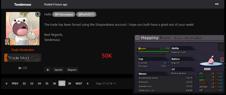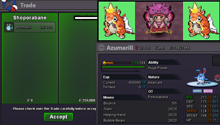 IF A TRADE MODERATOR HAVE TO FORCE A TRADE , ALL POKEMON WAS ON SHOPORABANE ACCOUNT Total Pokemon for sale : 306 Total Pokemon sold : 319 What you need to know First of all (Pokemon Lv 100 shop part) I capture, I do the Ev's and I level these to level 100. Then I sell them. Thanks to not complaining about some mooveset not done. Pokemon Shop Rules - Cross Server only if u come on SILVER. - Fake offers --> Instantly Reported. - No auction here. - First buyer who confirms the purchase will have the pokemon, even if someone intends to buy it more expensive. - Purchase can mixing Item and money, do the difference. - Only accept items on list Payment available - Capsule coin : 450.000$ each - Nature Rerol Ticket :300.000$ each - Iv's Rerol Ticket : 600.000$ each - Pokedollars - Rare candy : 6.000$ each - PP Up : 2.000$ each - PP Max : 6.000$ each Contact me here My information ingame Step 1 - PM this account ingame Step 2 - Join my storage account in Vermilion City Step 3 - Let's Trade Pokemon Shop Changelog Pokemon Lv.100 Trickroom AREA Untrained Trade Complete(238)1 point