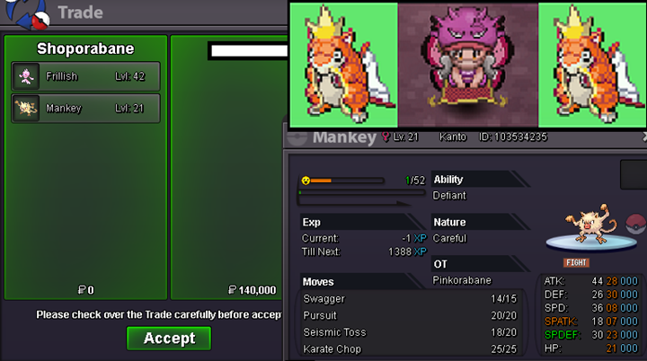 IF A TRADE MODERATOR HAVE TO FORCE A TRADE , ALL POKEMON WAS ON SHOPORABANE ACCOUNT Total Pokemon for sale : 328 Total Pokemon sold : 418 What you need to know First of all (Pokemon Lv 100 shop part) I capture, I do the Ev's and I level these to level 100. Then I sell them. Thanks to not complaining about some mooveset not done. Pokemon Shop Rules - Cross Server only if u come on SILVER. - Fake offers --> Instantly Reported. - No auction here. - First buyer who confirms the purchase will have the pokemon, even if someone intends to buy it more expensive. - Purchase can mixing Item and money, do the difference. - Only accept items on list Payment available - Capsule coin : 480.000$ each - Nature Rerol Ticket :340.000$ each - Iv's Rerol Ticket : 680.000$ each - Pokedollars - Rare candy : 6.000$ each - PP Up : 2.000$ each - PP Max : 6.000$ each Contact me here My information ingame Step 1 - PM this account ingame Step 2 - Join my storage account in Vermilion City Step 3 - Let's Trade Pokemon Shop Last Pokemon Added Pokemon Lv.100 Trickroom AREA Untrained Trade Complete(297)1 point