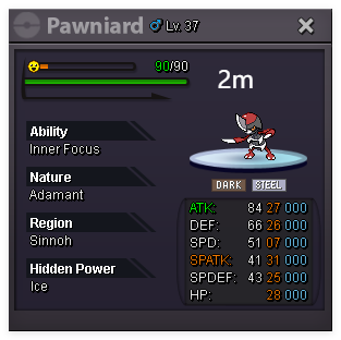 Auction Details: Start Price: 10m End Point: 48 hours (after start price is met) Insta Price: 17m Minimum Raise: 200k Accepted Payments: Pokedollars, Coin Capsules (x1 Coin Capsule = 400k), IV Reroll Tickets (x1 IV Reroll Ticket = 500k) Important Reminders: This is a Cross Server auction. You may bid from any server, and I will transfer to your preferred server upon winning. If you intend to purchase with an alt account, specify the account alongside your bid. If a bid is received in the final 15 minutes of the auction, the end point will be delayed by 15 minutes from that bid, and will be delayed by 15 minutes for each new bid thereafter, until the current offer has been held for a full 15 minutes. Happy Bidding!1 point