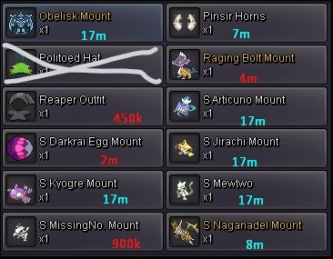 | - - | - - | - - | - - | - - | - - | [THE GOLDEN MAGAZI] | - - | - - | - - | - - | - - | - - | < - - - - - - - - - - - - - - - - - - - - [GIVEAWAY] - - - - - - - - - - - - - - - - - - - - > Hello Guys, We Want To Show You Our Cosmetics Here And Maybe If You Like Anything We Can Make A Deal?! < - - - - - - - - - - - - - - - - - - - - [SHOP SOS] - - - - - - - - - - - - - - - - - - - - > < - - - - - - - - - - - - - - - - - - - - [MUST READ] - - - - - - - - - - - - - - - - - - - - > [SOS : Please Read The ''NOT AVAILABLE'' List (Down) Before Buy Anything You Want] Makiz Cosmetics : [Shop Status] - [Online, Send For A Deal] - [Updated Recently] [Contact : (In Game Name : Makiz / Discord : Makiz_OFFICIAL) - Server ATM : Silver] Grahamsito's Cosmetics : [Shop Status] - [Online, Send For A Deal] - [Updated Today] [Contact : (In Game Name : Grahamsito / Discord : Grahamsito) - Server ATM : Silver] Payment Methods : Pokedollars Coin Capsule (450k) IV Re-roll Ticket (700k) Nat Re-roll Ticket (350k) Rare Candy (5k) [Makiz X Grahamsito] NOT Available Cosmetics : [LIVE] - (S Articuno Mount, Shield, Team Magma Set, Stormtrooper Helmet, ) BIGGEST SHOP's BUYERS EMOJIS REWARDS LIST Shop Uptades Logs1 point