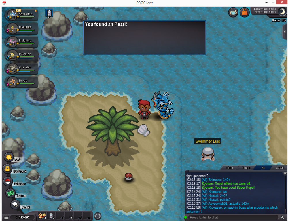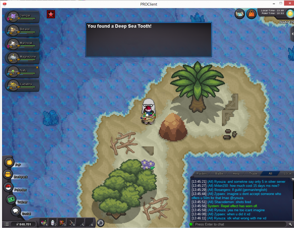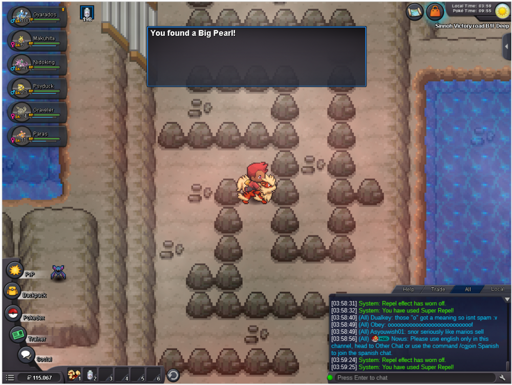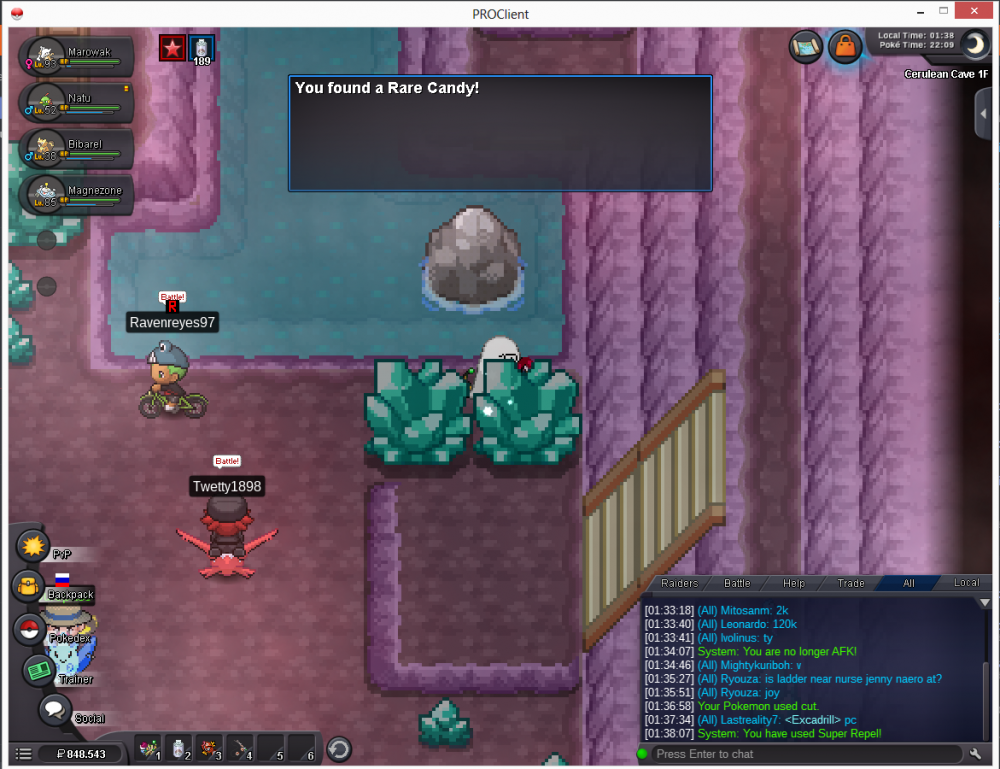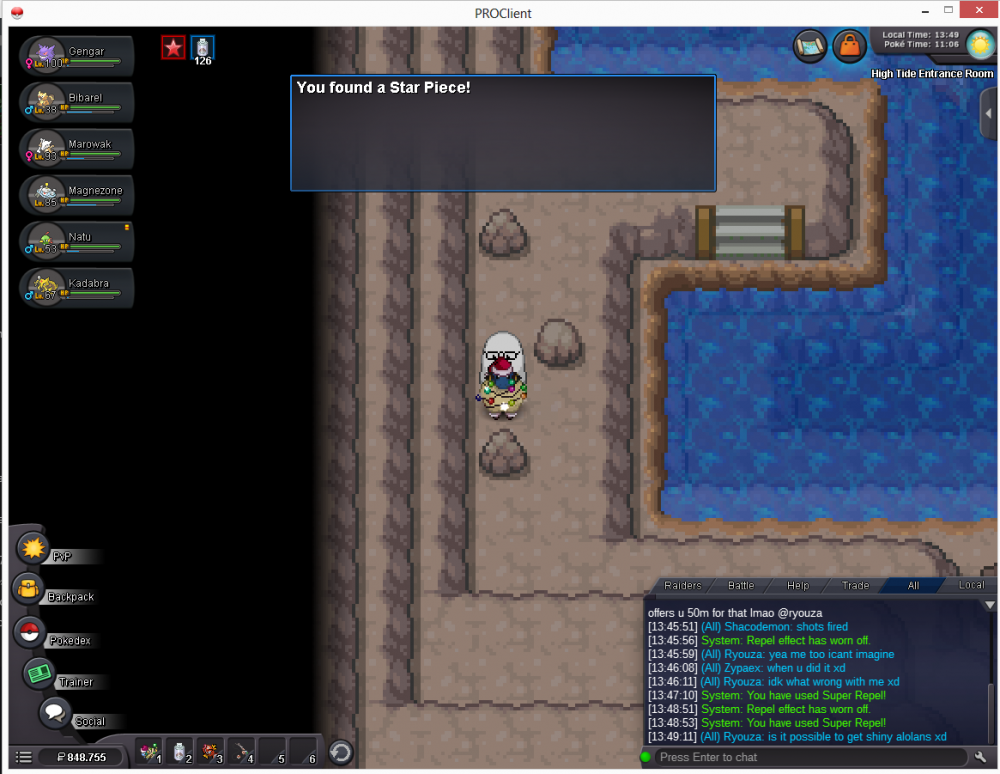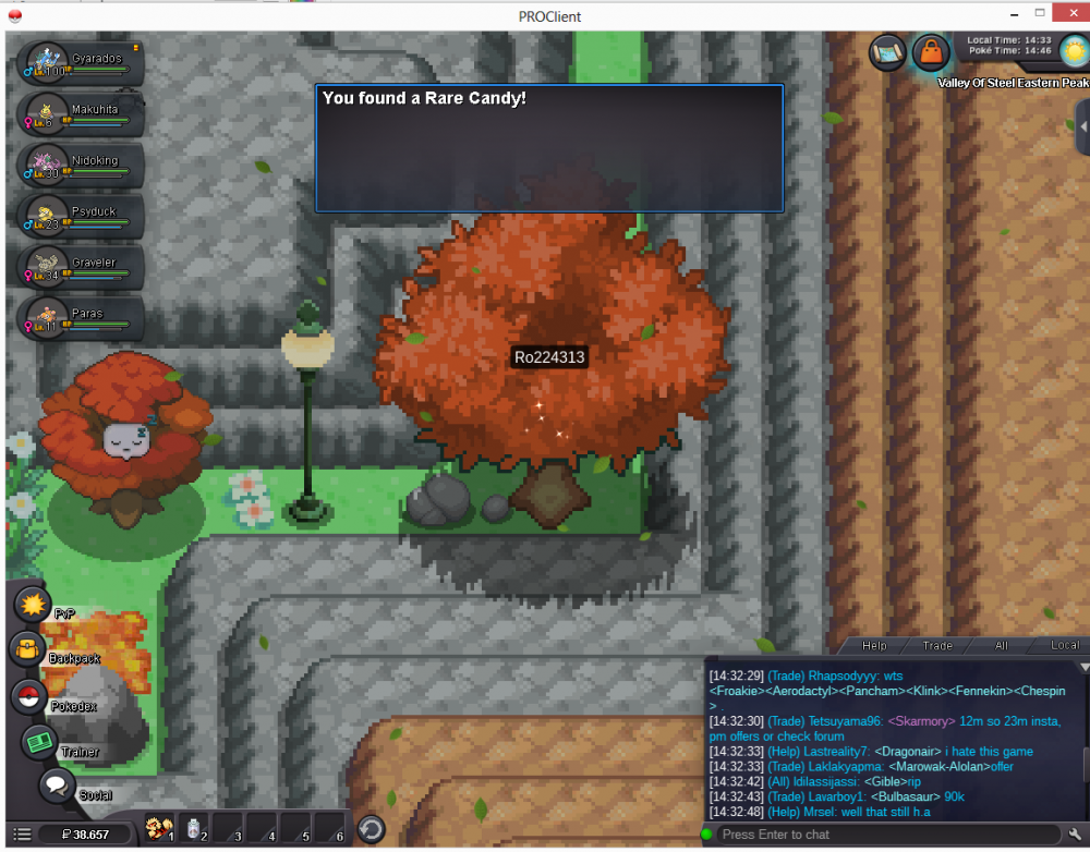 We have listed ALL of the locations of monetary items in PRO. We've calculated the money gain and taken screenshots and written down the location of all these items: Pearl, Big Pearl, Nugget, Stardust, Star Piece, Big Nugget, Big Mushroom, Small Mushroom. As an extra, I am also listing Rare Candy, since they seem to be of everyone's interest and they're insta sellable on the PROMarket. I've gone through the entire PRO Wiki and made an entire list of the places where the monetary items are. However, there's still a lot of items missing, missing info, and screenshots, and the previous guides for monetary items and hidden items are outdated and the pictures do not even work anymore. I've listed the places I've already been to and taken a screenshot of, but there's still a LOT to find out. I'd ask you all if you want to collaborate to come and help out to find the missing spots and the remaining screenshots for all the info we've gathered. I'm going to copy paste the list here and link the zip file with all my work for now. We are also missing the time frame in which these items respawn, as we are not 100% sure the Wiki info is correct since it's mostly outdated (some of these spots even changed). The guide is 99% done and can thus be considered complete, but it will be edited if any new findings appear or if anyone takes better screenshots of some areas. For now, pictures will be uploaded as attachments in the bottom of this post, and will be fixed and uploaded properly in the post itself. There are way too many pictures to be posted, so it would completely break the post order. We're constantly going to use the Hidden and Monetary Item Location Guide throughout this process: https://pokemonrevolution.net/forum/topic/132722-url ! Approximate Money Gain if you pick em all up. Big Nugget : 20k (x2 in total) = 40k Nugget: 5k (x10 in total) = 50k Pearl: 3k (x15 in total)= 45k Big Pearl: 9k (x6 in total) = 54k Stardust: 1.5k (x5 in total) = 7.5k Star Piece: 6k (x4 in total) = 24k Tiny Shroom: 1.5k (x1 in total) = 1.5k Total FIXED possible gain from grabbing everything: 369k Kanto Items Viridian City Rare Candy: Bottom side after the bridge. - 7 days. Viridian Forest Rare Candy; Behind the tree next to the maze. - 14 days. Mt Moon B1F Star Piece: South from the team rocket guy down the first ladder. - 14 days. Route 3 Stardust: In the first dig spots at the beggining of the route, it's in the northwestern rock. - doesn't respawn. Route 12 Rare Candy: South from the Camper Justin pokeball, 2 tiles down from it. - 14 days. Route 16 Rare Candy (Bicycle needed): Pokeball. - 14 days. Route 17 Rare Candy: East of Cue Ball Corey, between the rightmost pillars. - doesn't respawn. Seafoam B1F Pearl: Southeast from westmost B2F Ladder, tall stalagmite. Credits to Waleed1301 for the picture! - doesn't respawn. Seafoam B3F Pearl: East of the westmost tall stalagmite from the B2F ladder. - doesn't respawn. Seafoam B4F Nugget: Centermost stalagmite of the island reachable from the second eastmost B3F ladder. - doesn't respawn. Note: the location is different for each player. Route 27 Rare Candy: Left of the tree with an axe on it, near Johto Falls. - doesn't respawn. Kanto Extra Items Cerulean Cave 1F Nugget: Pokeball. - respawns, 14 days Cerulean Cave B1F Nugget: Rock smash some rocks and you will find it. Credit to Ashes55! Doesn't respawn. Ceru Cave 1F Rare Candy: Just when you enter, between the water and the rocks above the staircase in the entrance. - 7 days Love Island Diamond Domain Cave Rare Candy: Pokeball. - Doesn't respawn (for some reason) Island One Treasure Beach Starpiece: Next to the old man, under umbrella. - Doesn't respawn. Island One Kindle Road: In the thin line to the left of the saunas, hidden Nugget at the bottom of the sand - Doesn't respawn. Island Five Stardust: Rock to the left of the bridge, on the beach. - Doesn't respawn. Island Five Meadow Pearl: In the beach, the leftmost shell. Doesn't respawn. Island Five Chrono Chross Nugget: Behind a tree. - Doesn't respawn. Water Path Pearl: In the middle of the route, in the sand castle, - Doesn't respawn. Island Six Big Nugget: It's in the cave you have to go through while doing the Meowth Quest. Pokeball. - Doesn't respawn. Vulcan Island Shore Rare Candy: Enter the Vulcan Path, go to the bottom left, climb up the stairs, exit to the south. Next to the boss. - Can't check if it respawns. Vulcan Forest Rare Candies: Next to the northern exit. - Same as above. Johto Items Violet City Rare Candy: Behind the gym sign. - doesn't respawn Route 35 Nugget: Surfing to the left, below the berry tree patch. - doesn't respawn Burned Tower Floor 2 Nugget: In the top left center rocks. - doesn't respawn Bell Towe Rare Candy: In the last floor before Ho-Oh, behind the pillar. - doesn't respawn. Mt Mortar B1F Rare Candy: North East Corner Pokeball. - doesn't respawn. Forest Pit Rare Candy: small rock west and north from Halley. - doesn't respawn. Route 39 Nugget: To the lampost next of Sentret. - doesn't respawn. Olivine City Rare Candy: In a rock in front of the Lighthouse. - doesn't respawn Olivine City Pearl: In the rightmost tile in the horizontal fence to the southeast of the gym. - doesn't respawn Johto Extra Items Route 49 Rare Candy: In the Southmost Island. - doesn't respawn. Mt Silver 2F Rare Candy: In the central rock in the northern exit. - doesn't respawn. Ruins of Alph Rare Candy: In the interior south west corner. - doesn't respawn. Ruins of Alph Rare Candy: In the northwest one. - doesn't respawn. Hoenn Items Oldale Town Rare Candy: Under the pokecenter. respawns every 7 days Meteor Falls B1FR Stardust: Below tess. doesn't respawn New Mauville Rare Candy: South of the stairs. respawns every 7 days Fortree City Tiny Mushroom: Below the bridge on the bottom right.- Doesn't respawn Shoal Cave High Tide Entrance Room Star Piece: To the left of the entrance, on a rock. Doesn't respawn Sootopolis City Rare Candy: Next to the Poke Mart. Requir