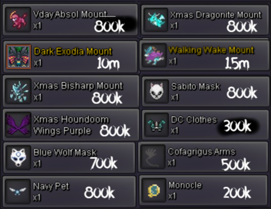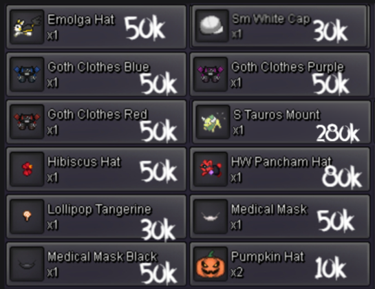 Welcome to Howie's Cosmetic Shop! Feel free to take a look around if you like anything! ACCEPTED PAYMENT METHODS: POKEDOLLARS COIN CAPSULES: 500K IV REROLL TICKETS: 700K NATURE REROLL TICKETS: 350K RARE CANDIES: 8K Ways to Contact Me! ^-^ DISCORD: Howeeb IN GAME NAME: Howieeh, Rit Disclaimers: 1. If you see the initials (N.T) next to an item, that means it's not tradeable 2. This shop will be updated every few weeks! 3. Prices under cosmetics can be negotiable! 4. All cosmetics under clearance are final price, and are NOT negotiable! 5. All sold items will be listed towards the bottom of the shop! CURRENT SERVER : GOLD Cosmetics! Clearance! SOLD OUT ITEMS: WALKING WAKE MOUNT, SABITO MASK, XMAS HOUNDOOM WINGS BLACK, PURPLE, RED, PINK, BANDIT MASK, HW MUDKIP SET, ELECTRIC CLOAK SET, VDAY RAICHU WINGS, HW VOLCARONA RING, VDAY NINETALES RING, XMAS UMBREON & VAPOREON MOUNTS, XMAS MUNCHLAX HAT, BUBBLEGUM PINK, S DITTO MOUNT, S TOGEKISS MOUNT, HW TOGEKISS MOUNT, FUR COAT, S MISSINGNO MOUNT, HW EMPOLEON MOUNT, XMAS DRAGONITE MOUNT, XMAS GARCHOMP MOUNT, HW GENGAR MOUNT, MAGIC MIRROR, XMAS HOUNDOOM MOUNT, DARK EXODIA MOUNT SOLD OUT CLEARANCE ITEMS: GOTH CLOTHES BLUE, RED, PURPLE, BEEDRILL WINGS, BUTTERFREE WINGS, MEDICAL MASK BLACK, MEDICAL MASK WHITE, STRAW HATS 1 & 2, WITCH HAT, ORANGE CLOTHES, BLACK HAT, DARK CLOAK Thanks for shopping!1 point