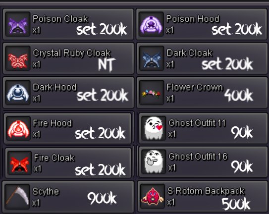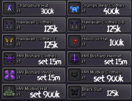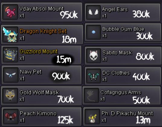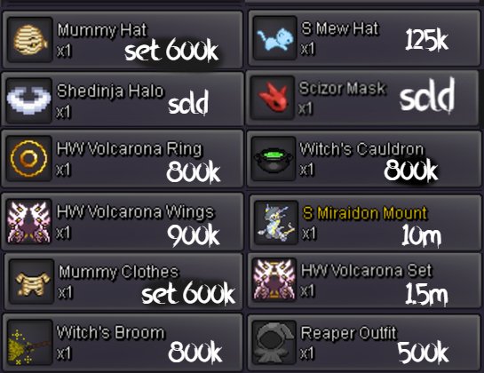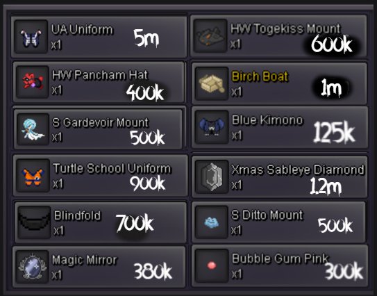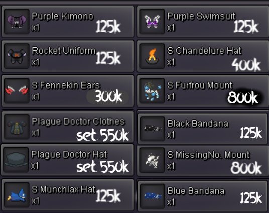 Welcome to INTERSHOP in Vermilion! Probably biggest Cosmetics Shop on Gold Server! Note: The list is not always updated immediately. Confirm availability via private message. The number in square brackets indicates the approximate number of available items. ★ ★ ★ =INTERSHOP= [WTS] WINGS / ACCESSORIES <devil.abra.tail.no-clothes/mask> 899k [2] ★ ★ ★ =INTERSHOP= [WTS] MOUNTS <hw.aggron.mount> 449k [1] <hw.magikarp.mount> 449k [2] <haxorus.mount> 199k [2] ★ ★ ★ =INTERSHOP= [WTS] CLOTHES <plague.clothes.no-hat/mask> 899k [3] <hw.bisharp.clothes.no-mask/gear/mask> 899k [1] <may4th.bisharp.clothes.no-hat/mask> 699k [3] <xmass.bisharp.clothes.no-hat/mask> 699k [3] <hw.minun.clothes.no-mask/gear> 299k [2] <hw.plulse.clothes.no-mask/gear> 299k [1] <summer.clothes.black-red.no-hat/gear> 149k [1] <summer.clothes.black-blue.no-mask/gear> 149k [1] <sumer.clothes.black-green.no-hat/gear> 149k [1] <white.suit.no-hat> 79k [3] <black.suit.no-hat> 79k [3] <bisharp.clothes.red.no-mask/hat> 79k [2] <casual.clothes.red.no-mask/gear> 19k [1] <casual.clothes.black.no-mask/gear> 19k [1] <casual.clothes.white.no-mask/gear> 19k [1] ★ ★ ★ =INTERSHOP= [WTS] MASKS <cult.mask.no-clothes> 1.2m [3] <sabito.mask.no-clothes> 999k [3] <wolf.mask.green.no-clothes> 999k [1] <wolf.mask.blue.no-clothes> 999k [1] <wolf.mask.red.no-clothes/gear> 999k [1] <ghostrider.mask.no-clothes/gear> 199k [2] <skull.no-clothes/gear> 99k [2] <aggron.helmet.normal.no-clothes/gear/eyes> 79k [3] <cubone.skull.no-gear/clothes> 79k[1] ★ ★ ★ =INTERSHOP= [WTS] HATS / HEADGEARS <grey.summer.hat.no-clothes/gear> 299k [3] <vday.tophat.no-clothes> 149k [3] <team.aqua.hat.no-clothes> 79k [2] <black.bandana.no-clothes/mask/gear> 79k [2] <black.sunnies.no-clothes> 79k [1] <fish.hat.black.no-clothes/mask/gear> 79k [3] <fish.hat.white.no-clothes/mask/gear> 79k [3] <fish.hat..no-clothes/gear/mask> 79k [3] <red.cap.no-clothes/mask> 69k [1] <sm.cap.red.no-clothes/mask> 39k [1] <sm.cap.black.no-clothes/mask> 39k [1] <straw.hat.no-clothes/gear/mask> 39k [1] ★ ★ ★ =INTERSHOP= [WTS] FACE ITEMS <diamond.eyes.no-clothes> 79k [3] <medical.mask.black.no-clothes> 79k [2] <medical.mask.white.no-clothes/hat> 79k [3] <medical.mask.blue.no-clothes> 79k [3] <male.glasses.1.np-clothes> 79k [1] <male.glasses.2.no-clothes> 79k [1] <male.glasses.4.no-clothes> 79k [1] <male.glasses.5.no-clothes/hat> 79k [1] + much items from coin shop! PM & Ask! + wts if tradeable this month: <akatsuki.robe> <drifloon.mount> <blue.punk.jacket> <dragon.slayer> <executioners.blade> INTERSHOP 2025 VERMILION GOLD SERVER vday lyre sold 500k, scythe sold 700k, sold mummy set 1cc, sold milotic eastern mount 1cc, sold hw aggron mount 1cc + 50k, sold mummy and deadpool set 1.7m, sold stormtrooper 850k + cc, sold jinx xmass wings 500k, sold bandana + team aqua hat + black mask 180k, deadpool set 1.2m, trooper set 1.2m, deadpool head sold 400k, , hw magikarp sold & gastly bday 950k, aggron mount sold 500k, chansey pokemon 100lvl sold 350k, vday gastly mount 360k, 4x plates 80k, tm body press 90k, vday gastly mount in jublife 370k and more1 point