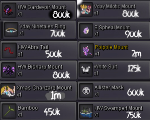 Hazepro's Mounts & Cosmetics Store 🕶Members of Genesis and New Leaf guilds get 10% discount on anything in the store 🕶 Contact information PRO name : Hazepro Discord : HazeYeager --------------------------------------------------------------------------------------------------------------------------------------------------------------------- Store policy 1 - Items with the word "NT" are not for trade 2 - There are no refunds and fake offers will be reported 3 - The customer is allowed to contact Hazepro through discord or pro to make business 4 - Prices are not fixed so customers can make offers 5 - The store accepts as forms of payment the following: Pokedollars Coin Capsules - 450k Reroll Tickets - 600k Nature Rerolls Tickets - 300k Rare Candies - 6k Other Cosmetics/Mounts - (Might be accepted or not depending on the items) --------------------------------------------------------------------------------------------------------------------------------------------------------------------- Disclaimer There will be a list on the bottom with the items that have alredy been sold Mounts Cosmetics and accessories List of items no longer available : may4th bisharp set, umbreon and azurill mounts, AF arbok, mummy set, Hw mimikyu disguise, XMAS bisharp set, Joker set, HW Gardevoir and Arcanine mounts, MAY4th bisharp mount, popstar pikachu, hydreigon mount sabito mask, red oni mask, dragon cloak, VDAY pikachu, dragonite mount, shiny charizard mount, doublade, ghost outfit 15, raging bolt mount ☆Hazepro thanks you for your patronage 🕶☆1 point