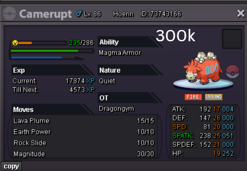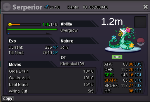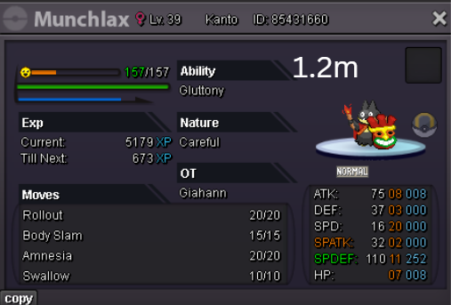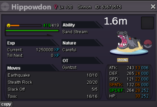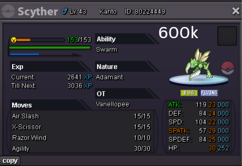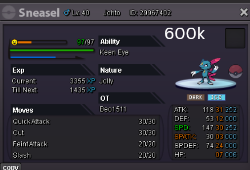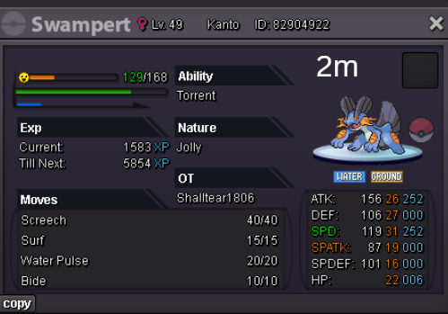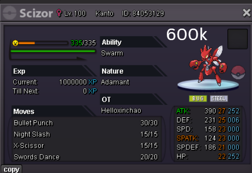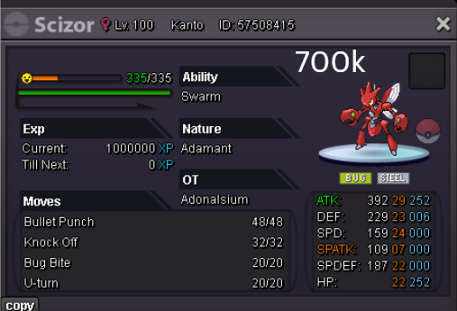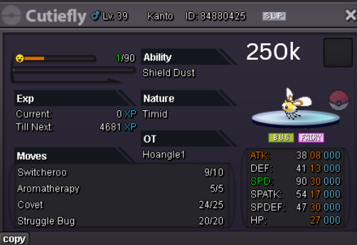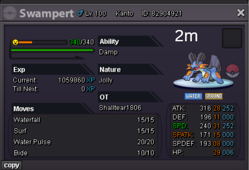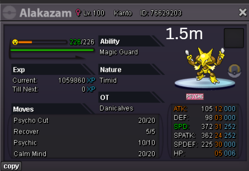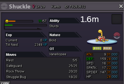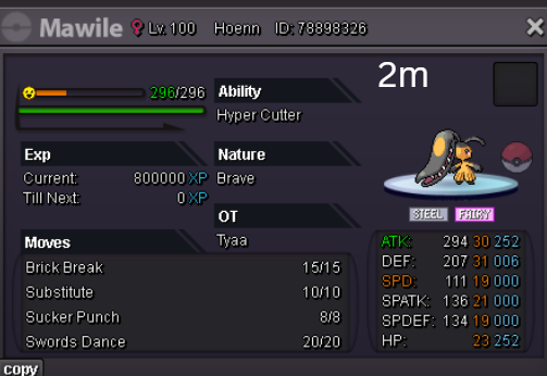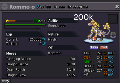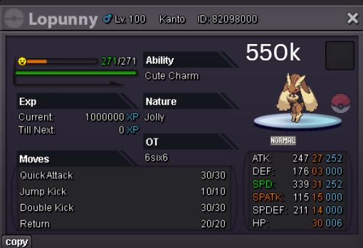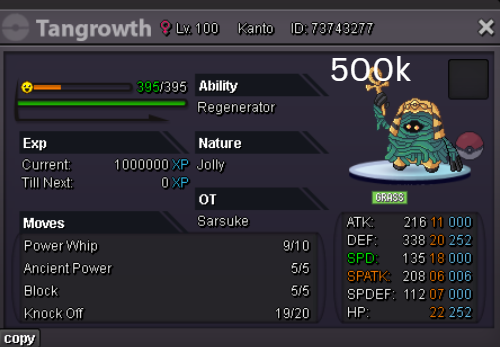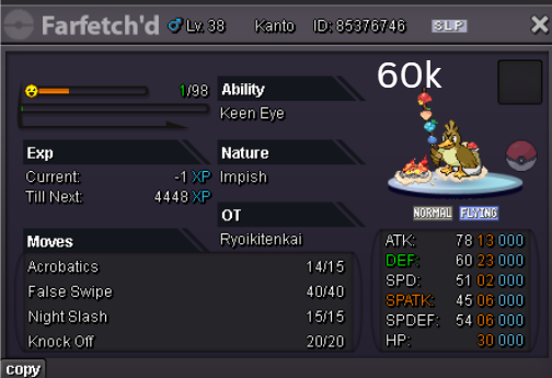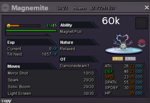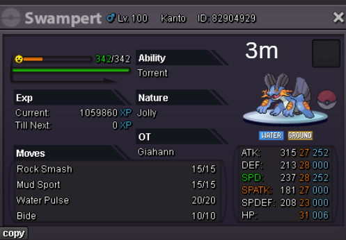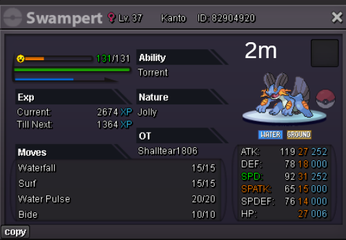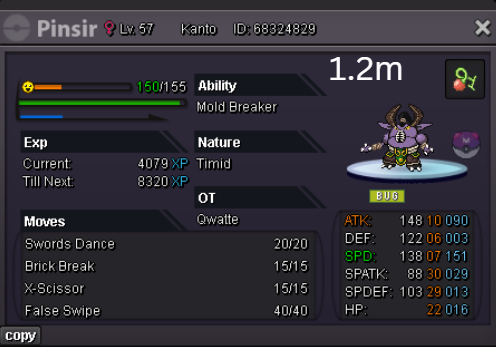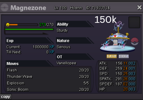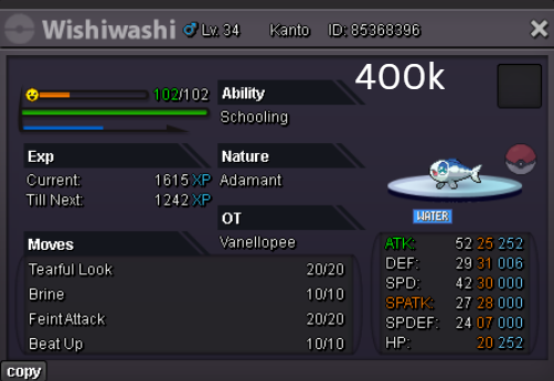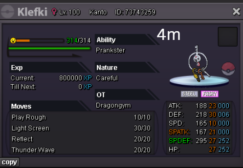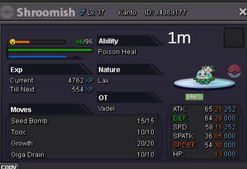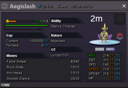 Team Preview: Extra: Items: Lagging Tail x1, Bright Powder x2 [I believe the one acquired from Goldenrod Underground Basement is bugged where it disappears from your bag completely when removed from a pokemon, so maybe just get the one from Officer Jenny quests (Celadon) and buy 1 more from another player], Wide Lens x1, Leftovers x2, Focus Sashes and Choice Band x1. Boss team details: -Number of Pokemon needed: 8 (6 for main team + 2 extra) -Baton passer: Ninjask. Why use this over a common Gorebyss or Huntail? Its specific type combination helps bait Fire/Rock/Ice type moves from Arcanine/Entei/Lucario Boss leads so they don't use Extreme Speed which can be a risk for Baton Passers. Ninjask can also reach 240+ Total Speed which is useful for simplifying Boss teams. Bonus: Ninjask is a Flying type and can be used as a party lead when trying to fight Brock so you can run away from wild Area Trap Digletts. -Target bosses: Any boss with hard mode + decent rewards and doesn’t need too many requirements to initiate battle. -Weekly boss run cycle: Fight 20 bosses from A.) Kanto + Sinnoh OR B.) Hoenn + Johto. -Other important notes: Has a working 3-poke only strategy against Ash Westbrook. Team setups benefitted a little from gen 9 mechanics making Teleport switch your pokemon to an ally safely and also with Blaziken having access to Knock off. Team has 2 steel types and an Iron Defense user for Steven (Boss). Stat requirements: Whimsicott – Prankster ability. Bold but any nature can work. Can be trash but higher defensive stats can help make runs safer and faster. Golduck – Any ability. Bold or Impish. 20+ IV on Speed, Defense and HP. Needs to reach 240 total Speed and have high Defense. Higher defensive stats can help make runs safer and faster. Magneton or Magnezone(choose 1): •Magneton – Sturdy ability. Timid nature with at least 11 Speed IV. Can be trash but higher defensive stats can help make runs safer and faster. Needs to reach 240 total Speed. •Magnezone – Sturdy ability. Timid nature. Needs 31 Speed IV so this one is harder to hunt. Can be trash but higher defensive stats can help make runs safer and faster. Needs to reach 240 total Speed. Make sure to teach it Teleport as Magnemite or Magneton cause it seems like it can’t be taught the move anymore as Magnezone. (Mods if you’re reading this, please fix) Otherwise, just use Explosion over Teleport which is less safe cause you can kill the Boss’s lead poke with it sometimes.) Probopass: Sturdy ability. Any nature but not those with -Speed. Only stat requirement is to have at least 2 Speed IV, but higher defensive stats can help make runs safer and faster. (I erased the stats in the image above because I gave it some unnecessary EVs like Speed when I should have just maxed HP and either Spdef or Def). Ninjask: Speed Boost ability. It can have any nature (even those with -Speed) and trash stats. Don’t give it HP EVs. Pangoro: Adamant nature with Mold Breaker ability. 27+ Atk IV. Speed IV can be 1 but total Speed should be 163 at least. Defensive stats aren’t required but can make runs safer in consideration of rare worst-case scenarios. Blaziken: Speed Boost ability with Adamant or Lonely nature. Attack and Speed IV can be as low as 1. 10+ IV on Spdef and HP but higher is safer. Klefki: Prankster ability. Any stats, low level and untrained. ***I’m probably using broken English already but pardon me if it will be much worse below because I need it to shorten and simplify things. Main Strategy: (Winning Method: 1-TW-SR) (Goal: To slow down the Boss’s lead pokemon and then give it debuffs of -6 accuracy stages or at least -4/-5 accuracy stages + Thunder Wave then setting up +6 Attack and at least +4 Speed buffs with Ninjask then Baton Passing those stats to Pangoro to help it sweep the opponents. +4 Speed is enough for all bosses. Stealth Rock is mainly there to break Focus Sashes since Pangoro’s Mold Breaker ability breaks through Sturdy ability but not FS.) Step by step: 1. Whimsicott: Switcheroo (Lagging tail) to slow down the Boss’s lead pokemon -> Whim can faint at this point but use Flash as many times as you can if Whim survives -> Memento if 6 flashes were applied then switch to Probopass immediately -> Otherwise, switch to Golduck 2. Golduck: Simple Beam (doubles the effect of Flash) -> Golduck can faint at this point but apply Flash as many times as you can if it didn’t (3 max) -> Switch or Hard Switch to Magneton/Magnezone. 3. Magneton/Magnezone: Flash if you need to do it more -> Thunder Wave if it survives -> Teleport to Probopass 4. Probopass: Thunder Wave if Magneton was unable to apply it -> Stealth Rock -> Explosion -> Switch to Ninjask 5. Ninjask: Substitute until opponent misses -> Swords Dance as long as Sub is up (3x) -> Use Protect to cheese some HP heals from Leftovers if the opponent keeps hitting your sub -> Baton Pass to Pangoro. (Winnable worst-case scenario: Boss’s lead pokemon kept being able to hit Ninjask’s Sub and its HP got too low to even make another Sub. This rarely happens though, and you just need to risk using Swords Dance even without Substitute up and then Baton pass to Pangoro if Ninjask survives. Pangoro also has Focus sash as another fail-safe measure.) 6. Pangoro: Spam boosted Power Trip. It kills anything, even ones with Dark Type resistance but not those with double type resistance. Use other moves if Power Trip gets disabled by Cursed Body. (Remember to replace Focus Sash if it breaks in a Boss battle) Moves not mentioned: -Golduck's Yawn is only useful for Boss battle with Winning Methods of 1, 1-CS and 1-EQ so you can immediately switch safely to Ninjask once able to apply all the necessary debuffs with Golduck still on the field. Yawn -> Protect -> Opponent falls asleep -> Hard switch to Ninjask -Cotton spore. (Refer to Tags: CS) -Iron Defense is used to access Steven (Boss) Tags: TW Make sure to apply Thunder Wave in this specific battle. Switching t