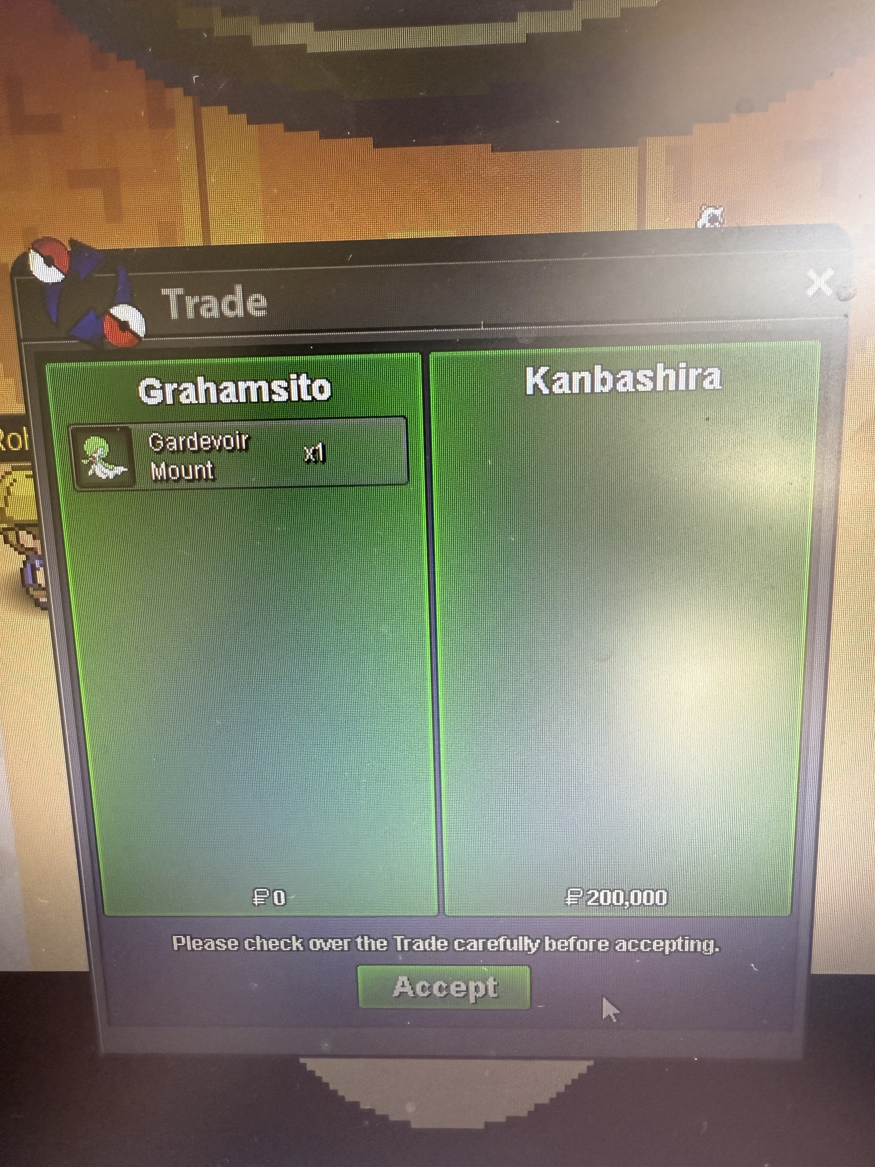Hello @Lolurface @Bagadzilla I have completed the trade 500k has been added to your account @Lolurface 500k has been removed from your account and the Pawniard is now in your possession @Bagadzilla Please make an effort to complete trades in future. Take care. - Rebilak1 point