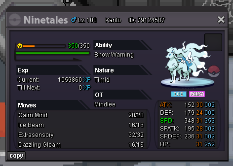 Auction Details: Start Price: 5m End Point: 5 days (after start price is met) Insta Price: N/A Minimum Raise: 500k Accepted Payments: Pokedollars, Coin Capsules (x1 Coin Capsule = 500k), IV Reroll Tickets (x1 IV Reroll Ticket = 750k) Important Reminders: This is a Cross Server auction. You may bid from any server, and I will transfer to your preferred server upon winning. If you intend to purchase with an alt account, specify the account alongside your bid. If a bid is received in the final 15 minutes of the auction, the end point will be delayed by 15 minutes from that bid, and will be delayed by 15 minutes for each new bid thereafter, until the current offer has been held for a full 15 minutes. Happy Bidding!1 point
