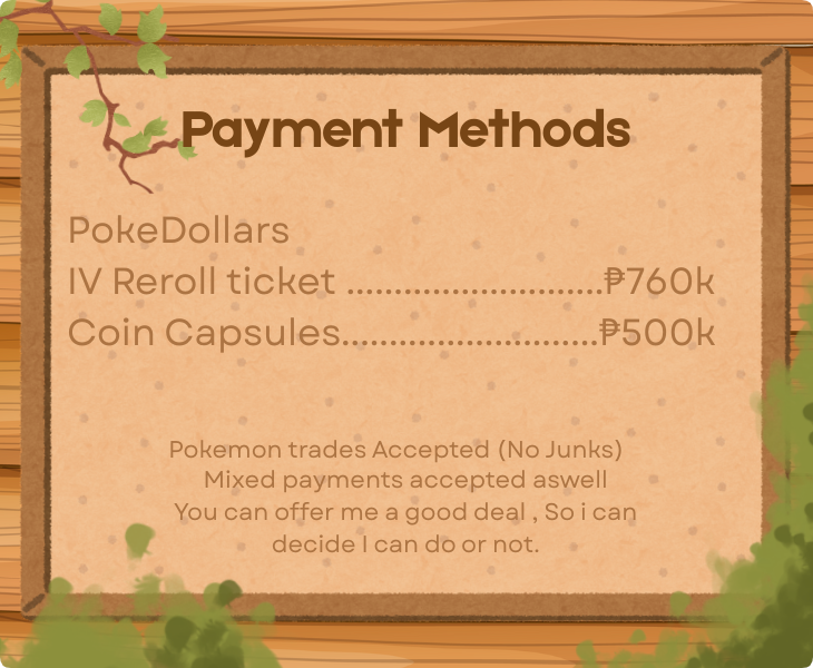 𝒞𝑜𝒹𝓎'𝓈 𝒥𝓊𝓃𝓀𝓎𝒶𝓇𝒹 INFO - SHOP RULES - Any fake offer will be reported. You can't cancel your offer. Buyers from the Gold server are welcome but they must transfer themselves to the Silver server. No Auction, Everything is Negotiatable. Pokedollars Reroll Ticket - 600k Nature Reroll - 300k Coin Capsule - 450k Rare Candy - 5k 𝓓𝓲𝓼𝓬𝓸𝓻𝓭: 𝓬𝓸𝓭𝔂𝓯𝓾𝓵 𝓘𝓷𝓰𝓪𝓶𝓮: 𝓒𝓸𝓭𝔂𝓯𝓾𝓵 Cosmetic (REWORKING) Cody's Shinies (Empty) Cody's Event Forms April Fools (EMPTY) Pikachu Forms MISC ITEM (EMPTY)1 point