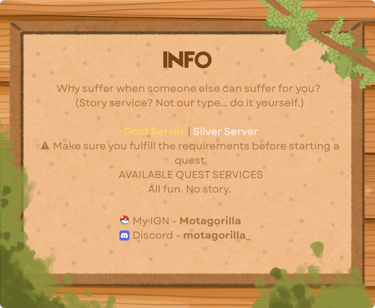 Do you want services as fast and reliable as lightening mcqueen ? Gotcha! I've done quite some services in the past, and now i'm opening a forum shop to better be able to take your orders. Daycare service: lvl up: 80k/poke (minimum 3) ev service: 40k/poke Dex service: need catch data for your legendary quests ? 3k/poke Story service: 10% off if you take all kanto 1-4: 600k kanto 5-8: 150k jhoto: 300k hoenn: 485k sinnoh: 375k Quest service: All quest requirements and needed items/$ must be on you account before i start the service Transport quest for kanto-jhoto/hoenn-sinnoh 150k each Wishlist:3 points