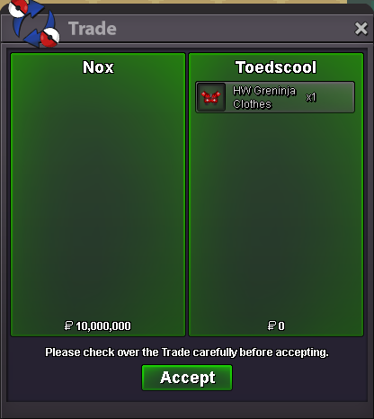Start Price : 5M Insta Price : 20M Current Bid : 7.5M by Sventapapere Min Bid : 500K End Point : 72hr after start price IGN : Lor3hc Auction Details - This is a Gold Server auction. If bidding from an alternative server, state that you will transfer upon winning. - If you intend to purchase with an alt account, specify the account alongside your bid. - If a bid is recived in the last 15 minutes of the auction, the end point will be delayed by 15 minutes from that bid, and will be delayed by 15 minutes for each new bid thereafter, until the current bid has been held for a full 15 minutes. Accepted Payments Pokedollars Coin Capsule (500k ea) Reroll Ticket (750k ea) Nature Reroll Ticket (350k ea)2 points