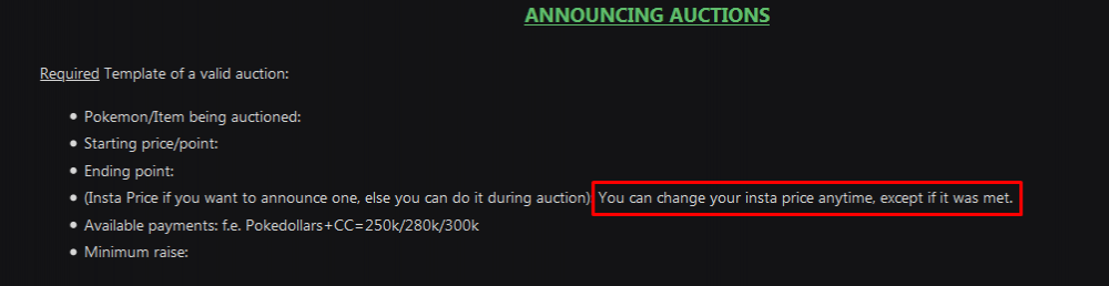 Anyone is free to suggest whatever they want, it's always a positive thing. But by suggesting "how to change" instead of "criticising" such rule. I'd say the current trade rules were over-worked on and revised many times from many perspectives just to try to balance between the power of buyers and sellers as much as possible, but yet of course there is no perfect system in the world so more rules or edits could be added at times. For example, the first instant price he had once the thread was made was 30m which the most could consider a pretty high price. If the seller can't change the instant then he would have his auction stuck nearly forever if there is no timing for instance as long as no one is offering such instant. This rule is actually flexible for everyone in fact that some of the sellers are new and don't know the real price of their stuff so they go for a high price as testing then start reducing it eventually, which could actually help them getting the maximum and fair possible profit out of a pokemon as well as its being fair for the buyers, I mean who wouldn't like the instant price being reduced for them for a pokemon that might interest them? Also, I have to mention that we have the power to audit auctions in full details and see how things get edited and if offers are fair or not and therefore, we act to correct things and in case the sell for a friend or a close third party then they are in a problem.