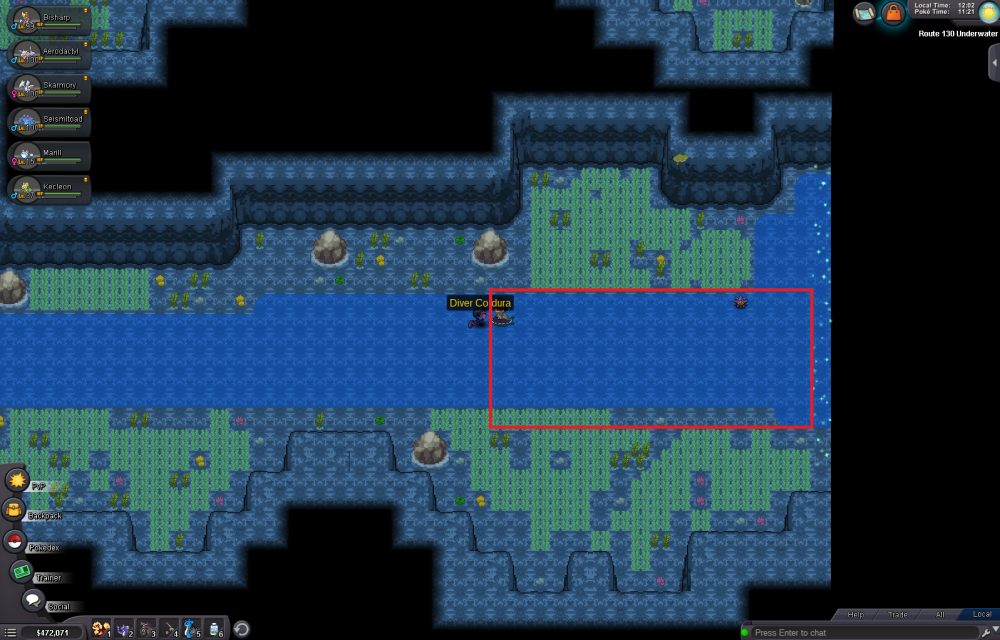 Even then, it's a pretty abbreviated bug report '^'. A full version would also have reproduction steps, reproduction rate, Current/Expected Result, perhaps keywords too~ But that gets too complicated for a front-end environment, so I skipped (っ'ヮ'c) Anyway, I found another case of soft-lock, happening again underwater. This time, it's in Route 130 Underwater, with Diver Cordura. Standing very far east in the area pointed by the screenshot, the game soft-locks again and behaves exactly like for Diver Yutaka. I'm thinking the cause might be because they move too far from their spawn point, as it does take a good while for them to reach me after a relog. On a side-note, I've also tried using an Escape Rope during the soft-lock. It does bring you back to the Pokemon Center, but you still remain unable to move until relogging. -