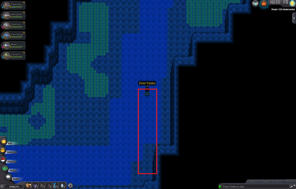 Hello~ In Route 126 Underwater, if you speak to Diver Yutaka while standing far enough south of the route, the game will soft-lock, as in he will not say anything, no battle will start, yet it will not be possible to move anymore, leaving the only possible option to relog. The soft-lock only occurs when standing in the area pointed in the screenshot. He will behave normally if he is spoken to from anywhere north of that area Notes: -This bug occurs regardless if he is available to fight or not, and regardless if it's him that challenges the player or not. -This bug was also reproduced on both my main and my alt accounts, so there doesn't seem to be any other factors for the bug to occur. -Unlike when you're in a dialog, it is possible to use items and reorder the party. Using an Escape Rope may also be possible.