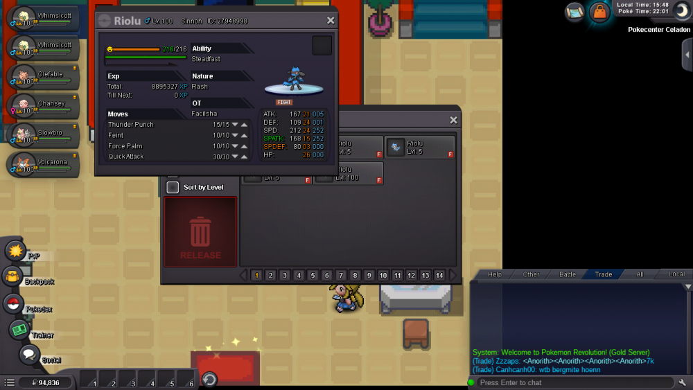 hola mi pareja en un ataque de ira me borro todos los pokemons lvl 100 que tenia, me podrian ayudar a recuperarlos. lamentablemente deje la contraseña en recordarla y entro sin problemas. espero su ayuda gracias de antemano. togekiss id 14491516+ choise scarf. bisharp id 26283094 + black glases staraptor id 28935432 + choise band donphan id 9642881 + rukie helmet